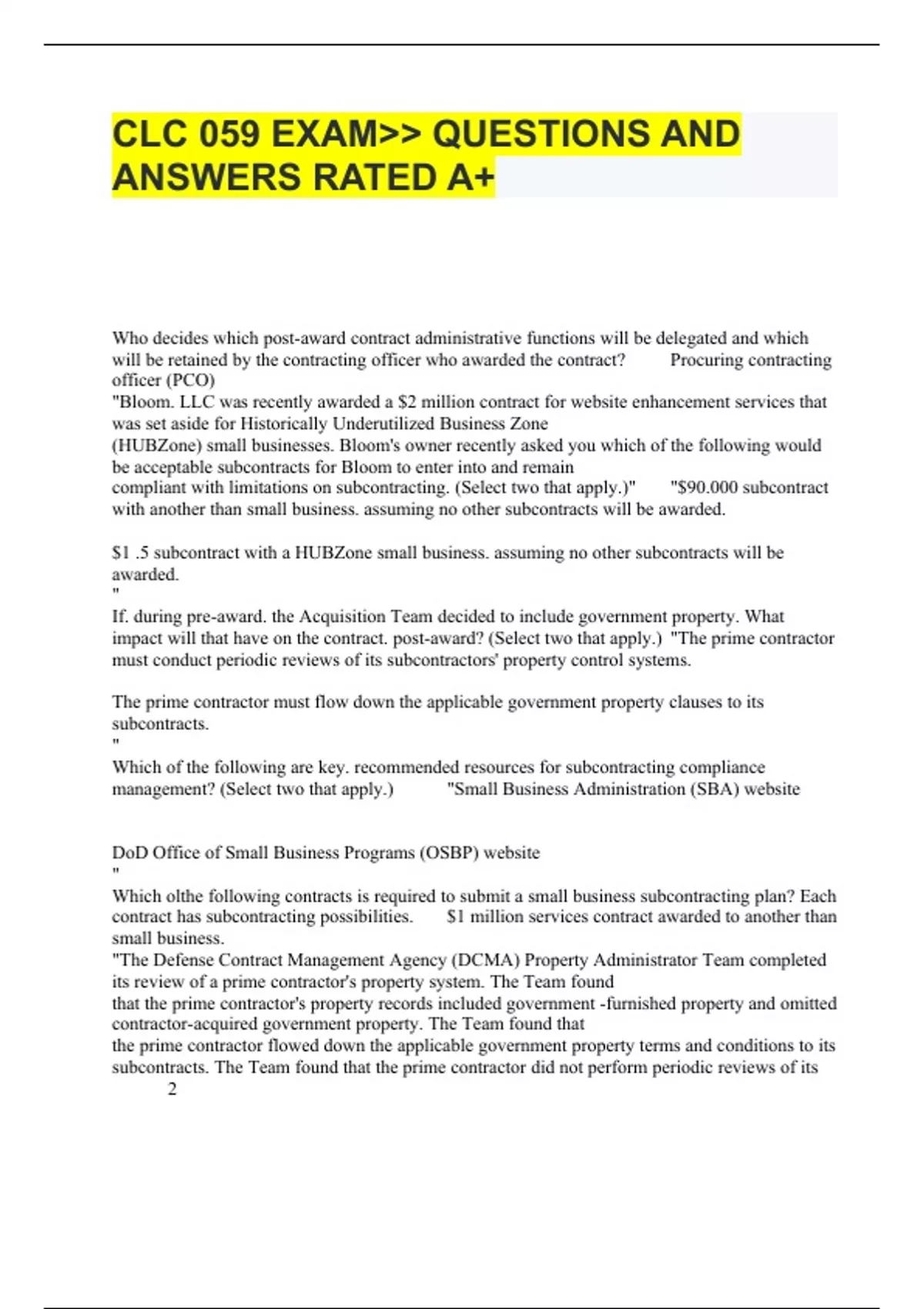 CLC 059 EXAM>> QUESTIONS AND ANSWERS RATED A+ Who decides which post-award contract administrative functions will be delegated and which will be retained by the contracting officer who awarded the contract? Procuring contracting officer (PCO) "Bloom. LLC was recently awarded a $2 million contract for website enhancement services that was set aside for Historically Underutilized Business Zone (HUBZone) small businesses. Bloom's owner recently asked you which of the following would be acceptable subcontracts for Bloom to enter into and remain compliant with limitations on subcontracting. (Select two that apply.)" "$90.000 subcontract with another than small business. assuming no other subcontracts will be awarded. $1 .5 subcontract with a HUBZone small business. assuming no other subcontracts will be awarded. " If. during pre-award. the Acquisition Team decided to include government property. What impact will that have on the contract. post-award? (Select two that apply.) "The prime contractor must conduct periodic reviews of its subcontractors' property control systems. The prime contractor must flow down the applicable government property clauses to its subcontracts.
