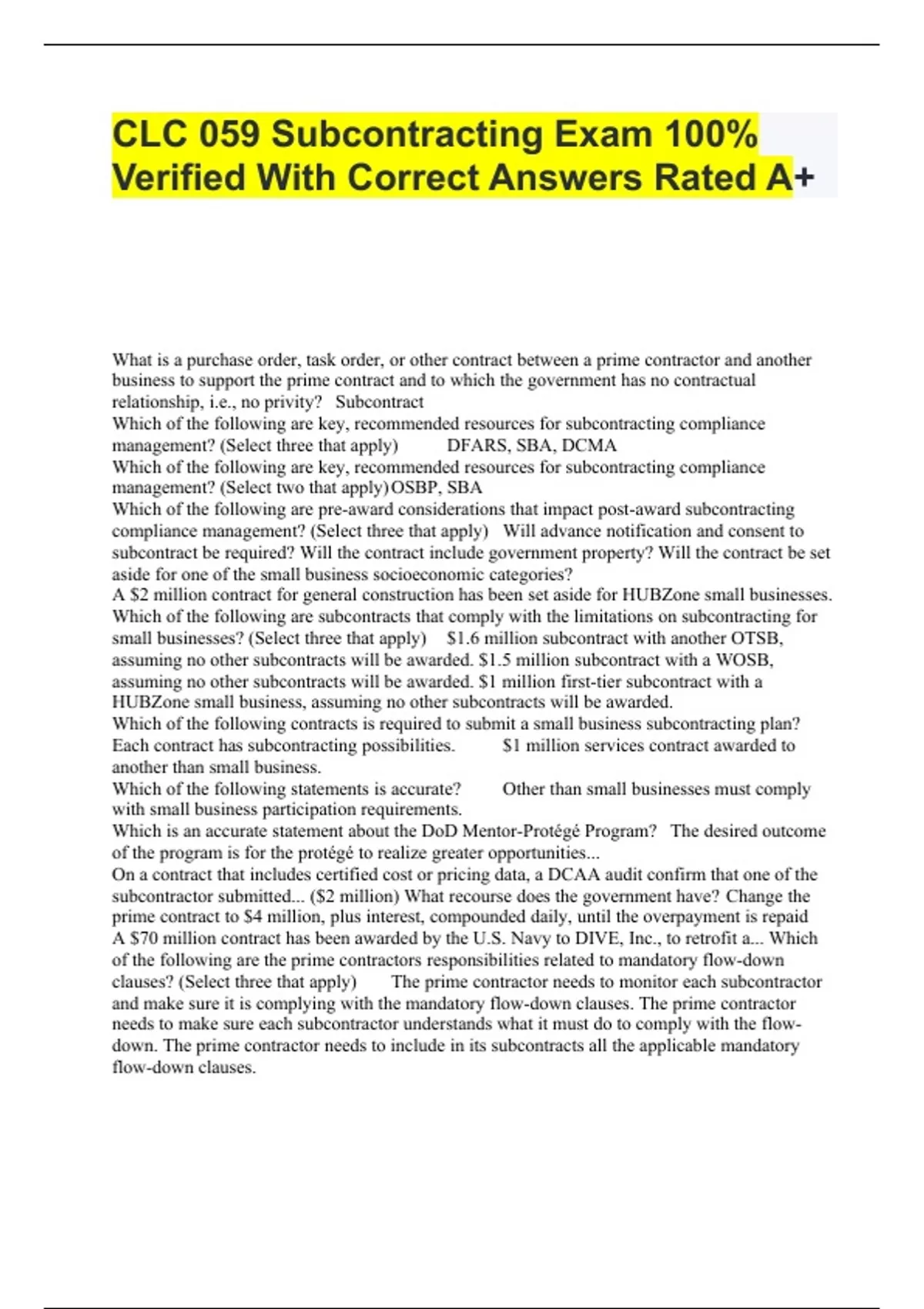CLC 059 Subcontracting Exam 100% Verified With Correct Answers Rated A+