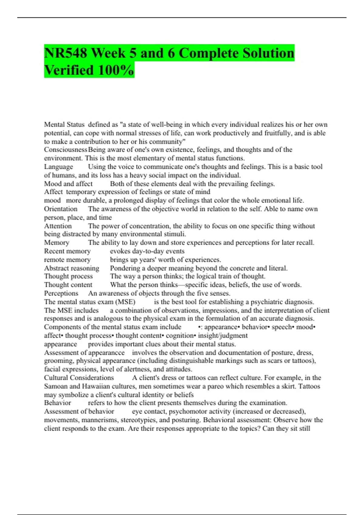 NR548 Week 5 and 6 Complete Solution Verified 100% Mental Status defined as "a state of well-being in which every individual realizes his or her own potential, can cope with normal stresses of life, can work productively and fruitfully, and is able to make a contribution to her or his community" Consciousness Being aware of one's own existence, feelings, and thoughts and of the environment. This is the most elementary of mental status functions. Language Using the voice to communicate one's thoughts and feelings. This is a basic tool of humans, and its loss has a heavy social impact on the individual. Mood and affect Both of these elements deal with the prevailing feelings. Affect temporary expression of feelings or state of mind mood more durable, a prolonged display of feelings that color the whole emotional life. Orientation The awareness of the objective world in relation to the self. Able to name own person, place, and time Attention The power of concentration, the ability to focus on one specific thing without being distracted by many environmental stimuli. Memory The ability to lay down and store experiences and perceptions for later recall. Recent memory evokes day-to-day events remote memory brings up years' worth of experiences. Abstract reasoning Pondering a deeper meaning beyond the concrete and literal. Thought process The way a person thinks; the logical train of thought. Thought content What the person thinks—specific ideas, beliefs, the use of words. Perceptions An awareness of objects through the five senses. The mental status exam (MSE) is the best tool for establishing a psychiatric diagnosis. The MSE includes a combination of observations, impressions, and the interpretation of client responses and is analogous to the physical exam in the formulation of an accurate diagnosis. Components of the mental status exam include •: appearance• behavior• speech• mood• affect• thought process• thought content• cognition• insight/judgment appearance provides important clues about their mental status. Assessment of appearancce involves the observation and documentation of posture, dress, grooming, physical appearance (including distinguishable markings such as scars or tattoos), facial expressions, level of alertness, and attitudes. Cultural Considerations A client's dress or tattoos can reflect culture. For example, in the Samoan and Hawaiian cultures, men sometimes wear a pareo which resembles a skirt. Tattoos may symbolize a client's cultural identity or beliefs Behavior refers to how the client presents themselves during the examination. Assessment of behavior eye contact, psychomotor activity (increased or decreased), movements, mannerisms, stereotypies, and posturing. Behavioral assessment: Observe how the client responds to the exam. Are their responses appropriate to the topics? Can they sit still
