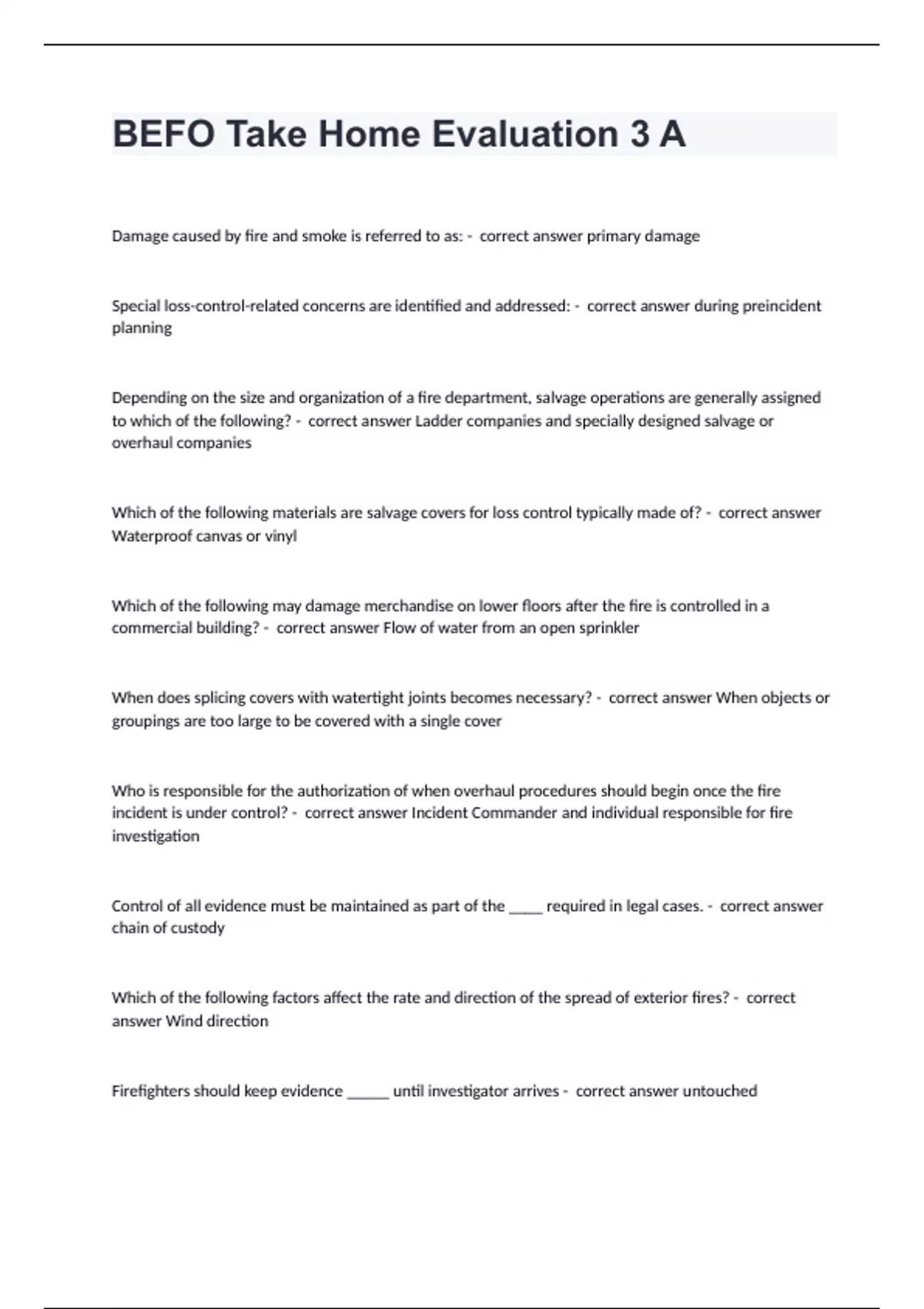 BEFO Take Home Evaluation 3 Question and answers correctly solved 2024 Damage caused by fire and smoke is referred to as: - correct answer primary damage Special loss-control-related concerns are identified and addressed: - correct answer during preincident planning Depending on the size and organization of a fire department, salvage operations are generally assigned to which of the following? - correct answer Ladder companies and specially designed salvage or overhaul companies Which of the following materials are salvage covers for loss control typically made of? - correct answer Waterproof canvas or vinyl Which of the following may damage merchandise on lower floors after the fire is controlled in a commercial building? - correct answer Flow of water from an open sprinkler When does splicing covers with watertight joints becomes necessary? - correct answer When objects or groupings are too large to be covered with a single cover