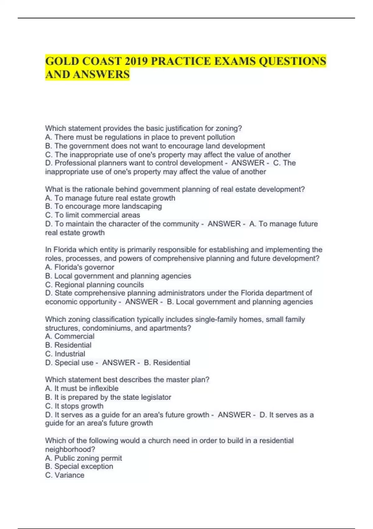 Which statement provides the basic justification for zoning? A. There must be regulations in place to prevent pollution B. The government does not want to encourage land development C. The inappropriate use of one's property may affect the value of another D. Professional planners want to control development - ANSWER - C. The inappropriate use of one's property may affect the value of another What is the rationale behind government planning of real estate development? A. To manage future real estate growth B. To encourage more landscaping C. To limit commercial areas D. To maintain the character of the community - ANSWER - A. To manage future real estate growth In Florida which entity is primarily responsible for establishing and implementing the roles, processes, and powers of comprehensive planning and future development? A. Florida's governor B. Local government and planning agencies C. Regional planning councils D. State comprehensive planning administrators under the Florida department of economic opportunity - ANSWER - B. Local government and planning agencies Which zoning classification typically includes single-family homes, small family structures, condominiums, and apartments? A. Commercial B. Residential C. Industrial D. Special use - ANSWER - B. Residential Which statement best describes the master plan? A. It must be inflexible B. It is prepared by the state legislator C. It stops growth D. It serves as a guide for an area's future growth - ANSWER - D. It serves as a guide for an area's future growth Which of the following would a church need in order to build in a residential neighborhood? A. Public zoning permit B. Special exception C. Variance D. Nonconforming use permit - ANSWER - B. Special exception What is the purpose of the zoning board of adjustment? A. To settle monetary claims by property owners B. To grant variances and special exceptions C. To develop the comprehensive plan D. To determine infrastructure requirements - ANSWER - B. To grant variances and special exceptions Which term is used to describe a property use that predates the current zoning ordinance but is allowed to exist for at least a period of time? A. Legally conforming B. Progressive C. Legally nonconforming D. Capitalized - ANSWER - C. Legally nonconforming Which statement which best describes a Planned Unit Development (PUD)? A. A PUD offers fewer amenities than are possible with more traditional forms of zoning B. A PUD impacts the environment to a greater degree than most zoning classifications C. A PUD prohibits the use of zero lot line development D. A PUD is also called cluster zoning - ANSWER - C. A PUD is also called cluster zoning Which statement is correct with respe