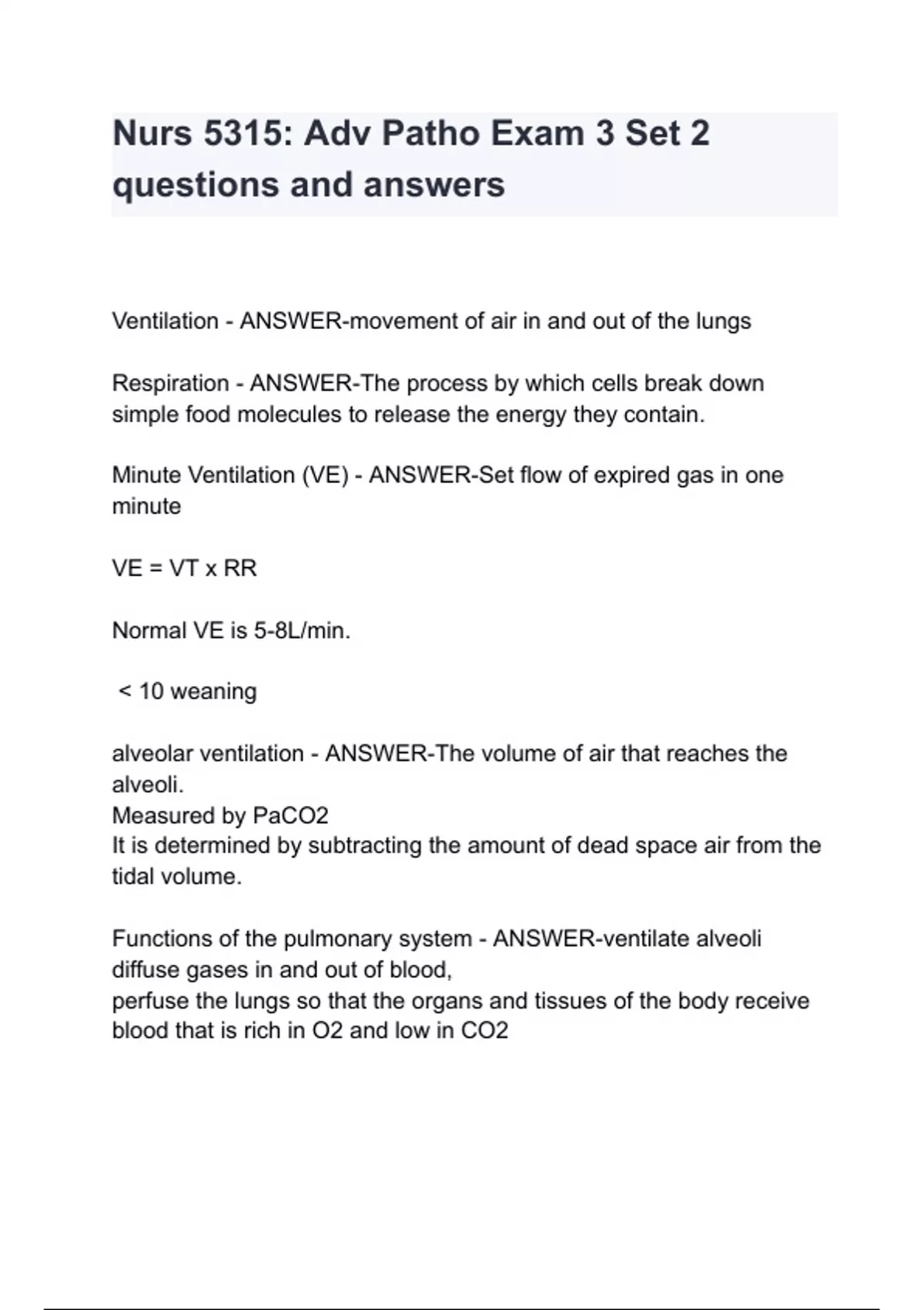 Ventilation - ANSWER-movement of air in and out of the lungs Respiration - ANSWER-The process by which cells break down simple food molecules to release the energy they contain. Minute Ventilation (VE) - ANSWER-Set flow of expired gas in one minute VE = VT x RR Normal VE is 5-8L/min. < 10 weaning alveolar ventilation - ANSWER-The volume of air that reaches the alveoli. Measured by PaCO2 It is determined by subtracting the amount of dead space air from the tidal volume. Functions of