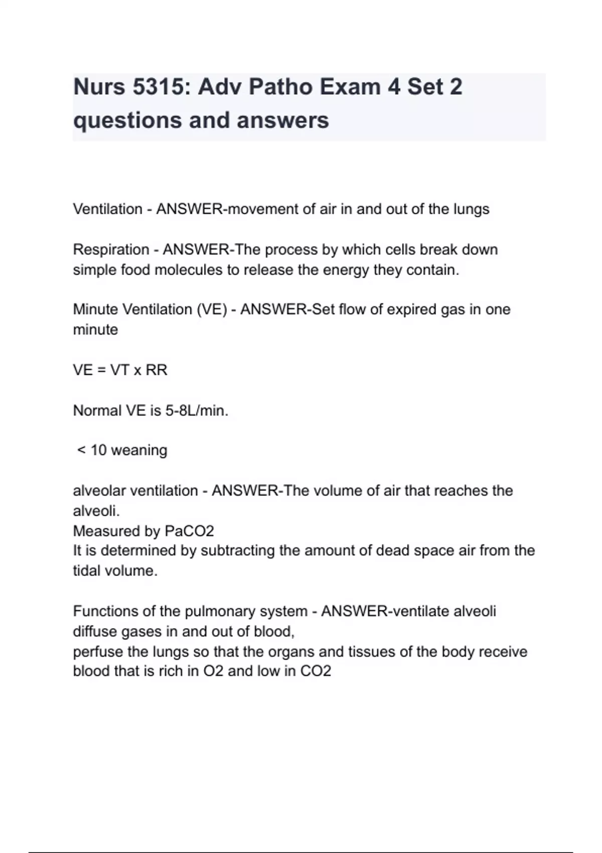 Ventilation - ANSWER-movement of air in and out of the lungs Respiration - ANSWER-The process by which cells break down simple food molecules to release the energy they contain. Minute Ventilation (VE) - ANSWER-Set flow of expired gas in one minute VE = VT x RR Normal VE is 5-8L/min. < 10 weaning alveolar ventilation - ANSWER-The volume of air that reaches the alveoli. Measured by PaCO2 It is determined by subtracting the amount of dead space air from the tidal volume. Functions of the pulmonary system - ANSWER-ventilate alveoli diffuse gases
