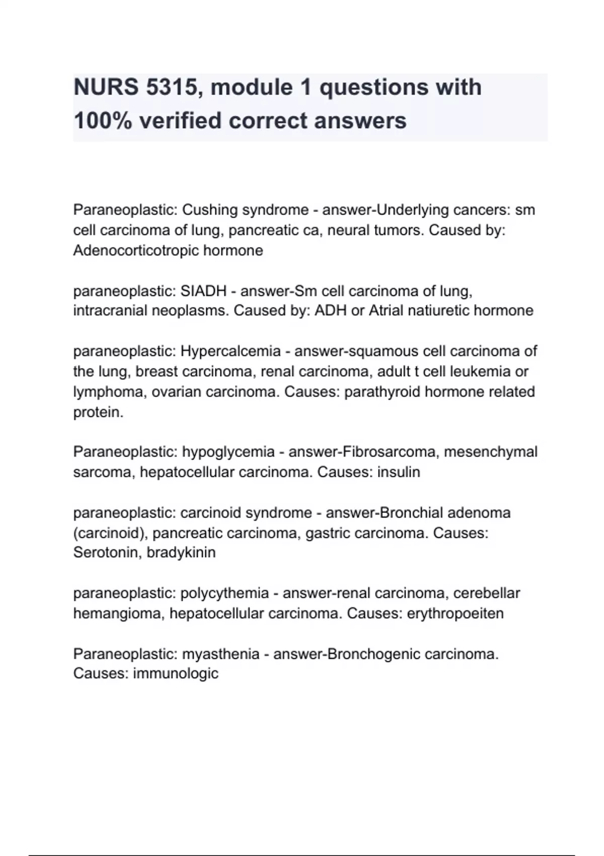 Paraneoplastic: Cushing syndrome - answer-Underlying cancers: sm cell carcinoma of lung, pancreatic ca, neural tumors. Caused by: Adenocorticotropic hormone paraneoplastic: SIADH - answer-Sm cell carcinoma of lung, intracranial neoplasms. Caused by: ADH or Atrial natiuretic hormone paraneoplastic: Hypercalcemia - answer-squamous cell carcinoma of the lung, breast carcinoma, renal carcinoma, adult t cell leukemia or lymphoma, ovarian carcinoma. Causes: parathyroid hormone related protein. Paraneoplastic: hypoglycemia - answer-Fibrosarcoma, mesenchymal sarcoma, hepatocellular carcinoma. Causes: insulin paraneoplastic: carcinoid syndrome - answer-Bronchial adenoma (carcinoid), pancreatic carcinoma, gastric carcinoma. Causes: Serotonin, bradykinin paraneoplastic: polycythemia - answer-renal carcinoma, cerebellar hemangioma, hepatocellular carcinoma. Causes: erythropoeiten Paraneoplastic: