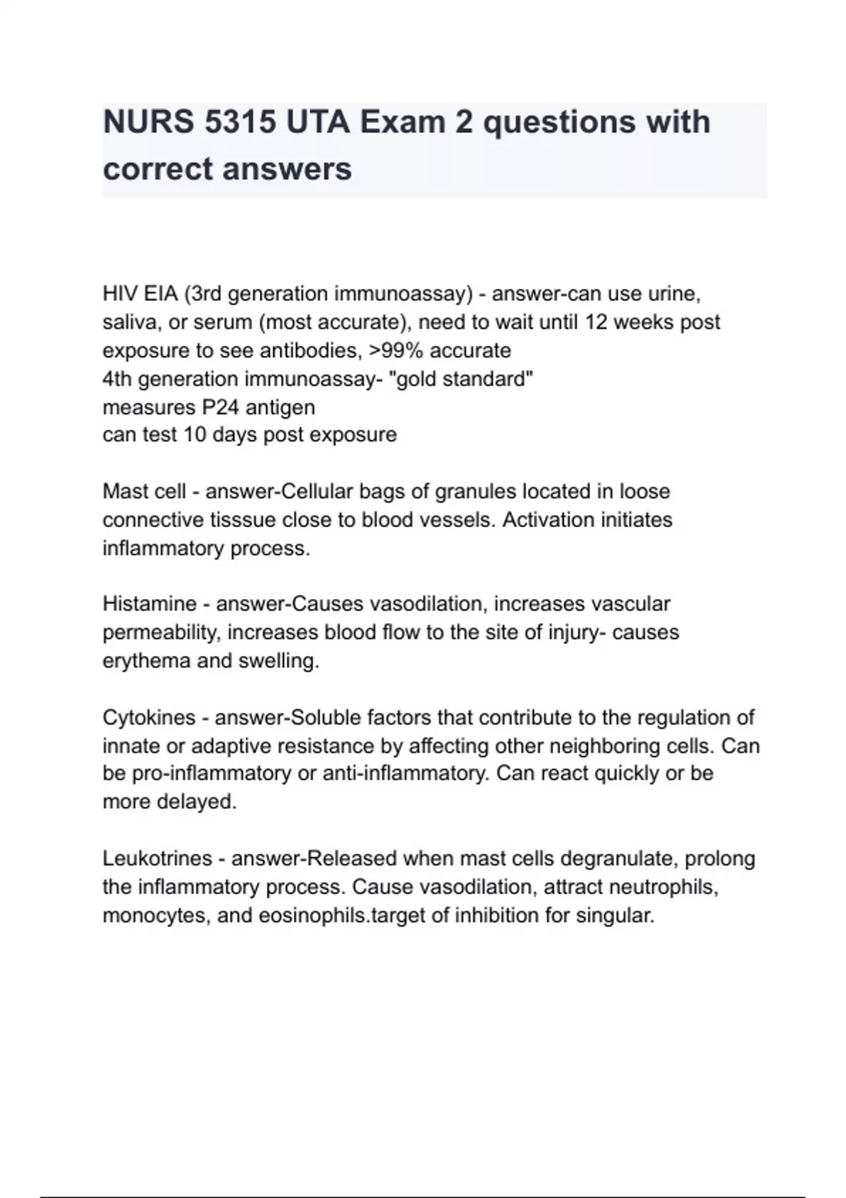 HIV EIA (3rd generation immunoassay) - answer-can use urine, saliva, or serum (most accurate), need to wait until 12 weeks post exposure to see antibodies, >99% accurate 4th generation immunoassay- "gold standard" measures P24 antigen can test 10 days post exposure Mast cell - answer-Cellular bags of granules located in loose connective tisssue close to blood vessels. Activation initiates inflammatory process. Histamine - answer-Causes vasodilation, increases vascular permeability, increases blood flow to the site of injury- causes erythema and swelling. Cytokines - answer-Soluble factors that contribute to the regulation of innate or adaptive resistance by affecting other neighboring cells. Can be pro-inflammatory or anti-inflammatory. Can react quickly or be more delayed. Leukotrines - answer-Released when mast cells degranulate, prolong the inflammato
