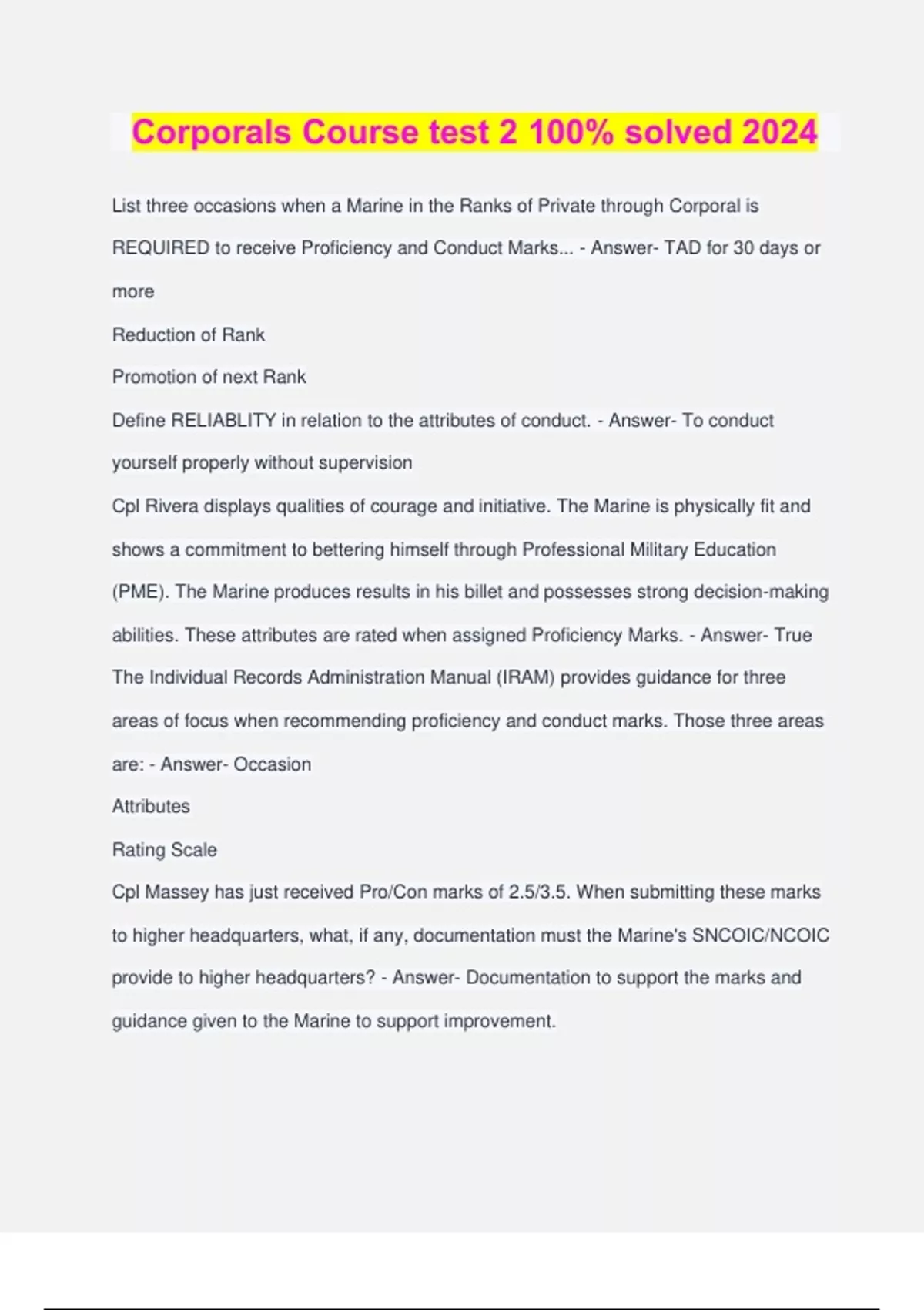 Corporals Course test 2 100% solved 2024 List three occasions when a Marine in the Ranks of Private through Corporal is REQUIRED to receive Proficiency and Conduct Marks... - Answer- TAD for 30 days or more Reduction of Rank Promotion of next Rank Define RELIABLITY in relation to the attributes of conduct. - Answer- To conduct yourself properly without supervision Cpl Rivera displays qualities of courage and initiative. The Marine is physically fit and shows a commitment to bettering himself through Professional Military Education (PME). The Marine produces results in his billet and possesses strong decision-making abilities. These attributes are rated when assigned Proficiency Marks. - Answer- True The Individual Records Administration Manual (IRAM) provides guidance for three areas of focus when recommending proficiency and conduct marks. Those three areas are: - Answer- Occasion Attributes Rating Scale Cpl Massey has just received Pro/Con marks of 2.5/3.5. When submitting these marks to higher headquarters, what, if any, documentation must the Marine's SNCOIC/NCOIC provide to higher headquarters? - Answer- Documentation to support the marks and guidance given to the Marine to support improvement. Cpl Carpenter's average Pro/Con marks for his Marine Corps career are 3.0/4.0. What type of discharge would be warranted for this Marine upon separation from the Marine Corps? - Answer- Honorable Define the goal of the Marine Corps promotion system. - Answer- To promote the most qualified Marines. How often are composite scores computed for your Military Occupational Specialty (MOS)? - Answer- Quarterly to update TIS, TIG and update yearly training including Range, CFT or PFT.