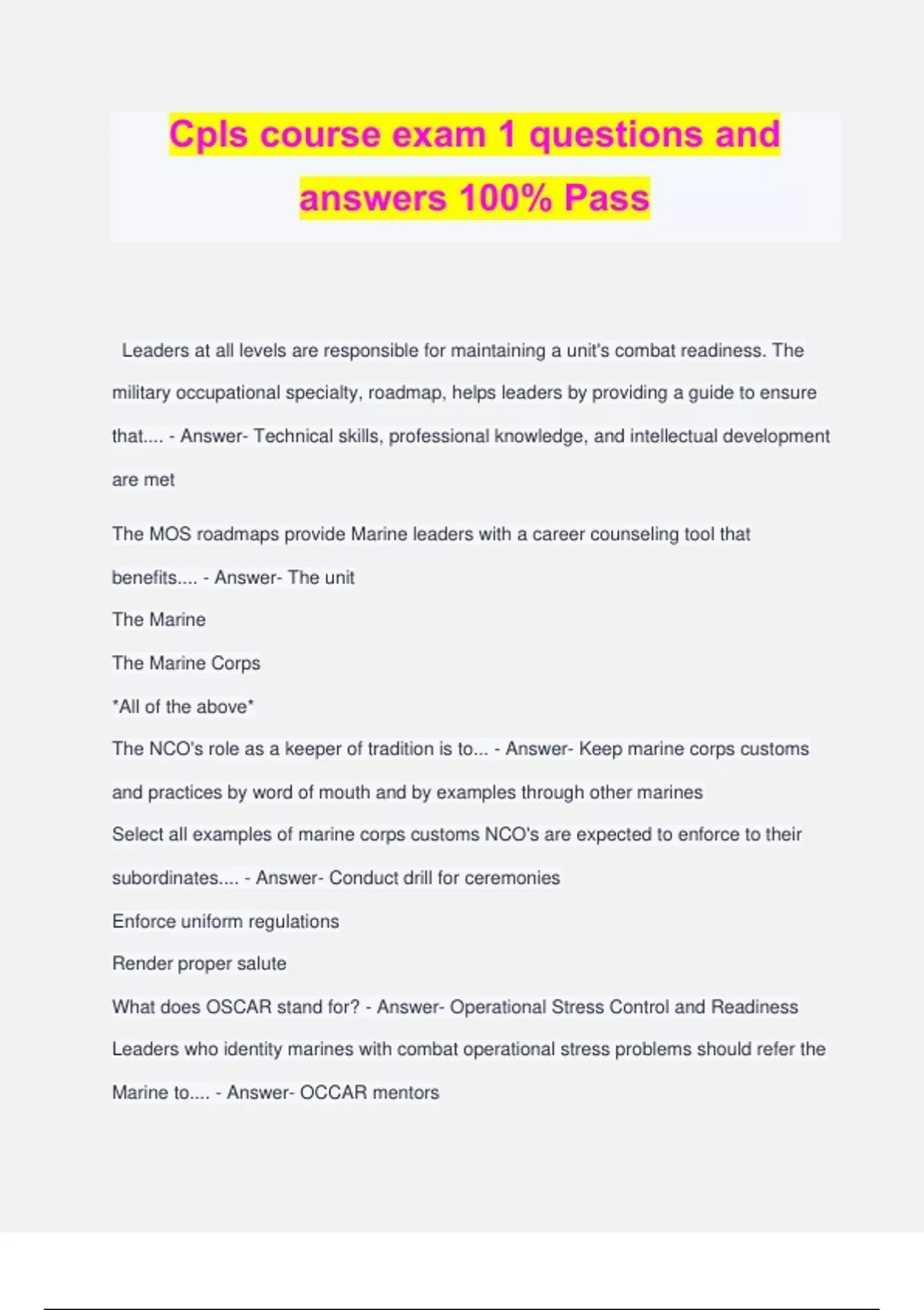Cpls course exam 1 questions and answers 100% Pass Leaders at all levels are responsible for maintaining a unit's combat readiness. The military occupational specialty, roadmap, helps leaders by providing a guide to ensure that.... - Answer- Technical skills, professional knowledge, and intellectual development are met The MOS roadmaps provide Marine leaders with a career counseling tool that benefits.... - Answer- The unit The Marine The Marine Corps *All of the above* The NCO's role as a keeper of tradition is to... - Answer- Keep marine corps customs and practices by word of mouth and by examples through other marines Select all examples of marine corps customs NCO's are expected to enforce to their subordinates.... - Answer- Conduct drill for ceremonies Enforce uniform regulations Render proper salute What does OSCAR stand for? - Answer- Operational Stress Control and Readiness Leaders who identity marines with combat operational stress problems should refer the Marine to.... - Answer- OCCAR mentors