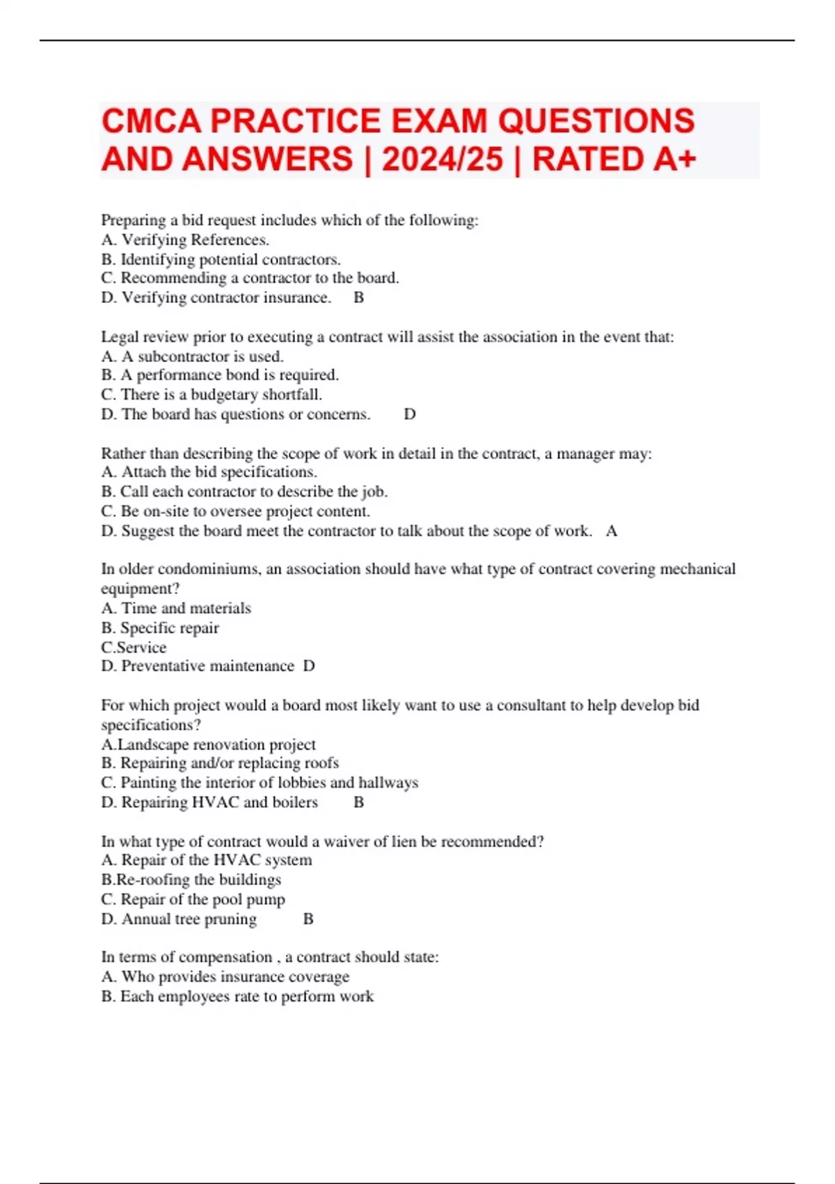 CMCA PRACTICE EXAM QUESTIONS AND ANSWERS | 2024/25 | RATED A+