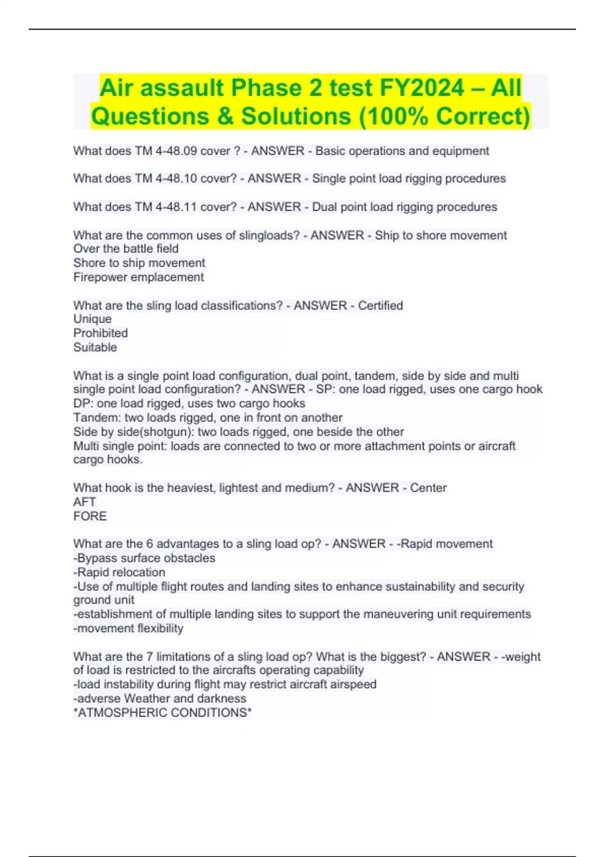 Air assault Phase 2 test FY2024 – All Questions & Solutions (100% Correct) Air assault Phase 2 test FY2024 – All Questions & Solutions (100% Correct) What does TM 4-48.09 cover ? - ANSWER - Basic operations and equipment What does TM 4-48.10 cover? - ANSWER - Single point load rigging procedures What does TM 4-48.11 cover? - ANSWER - Dual point load rigging procedures What are the common uses of slingloads? - ANSWER - Ship to shore movement Over the battle field Shore to ship movement Firepower emplacement What are the sling load classifications? - ANSWER - Certified Unique Prohibited Suitable What is a single point load configuration, dual point, tandem, side by side and multi single point load configuration? - ANSWER - SP: one load rigged, uses one cargo hook DP: one load rigged, uses two cargo hooks Tandem: two loads rigged, one in front on another Side by side(shotgun): two loads rigged, one beside the other Multi single point: loads are connected to two or more attachment points or aircraft cargo hooks. What hook is the heaviest, lightest and medium? - ANSWER - Center AFT FORE What are the 6 advantages to a sling load op? - ANSWER - -Rapid movement -Bypass surface obstacles -Rapid relocation -Use of multiple flight routes and landing sites to enhance sustainability and security ground unit -establishment of multiple landing sites to support the maneuvering unit requirements -movement flexibility What are the 7 limitations of a sling load op? What is the biggest? - ANSWER - -weight of load is restricted to the aircrafts operating capability -load instability during flight may restrict aircraft airspeed -adverse Weather and darkness *ATMOSPHERIC CONDITIONS* - limited number of helicopters -landing site surface conditions -landing site being increased because of reduced visibility