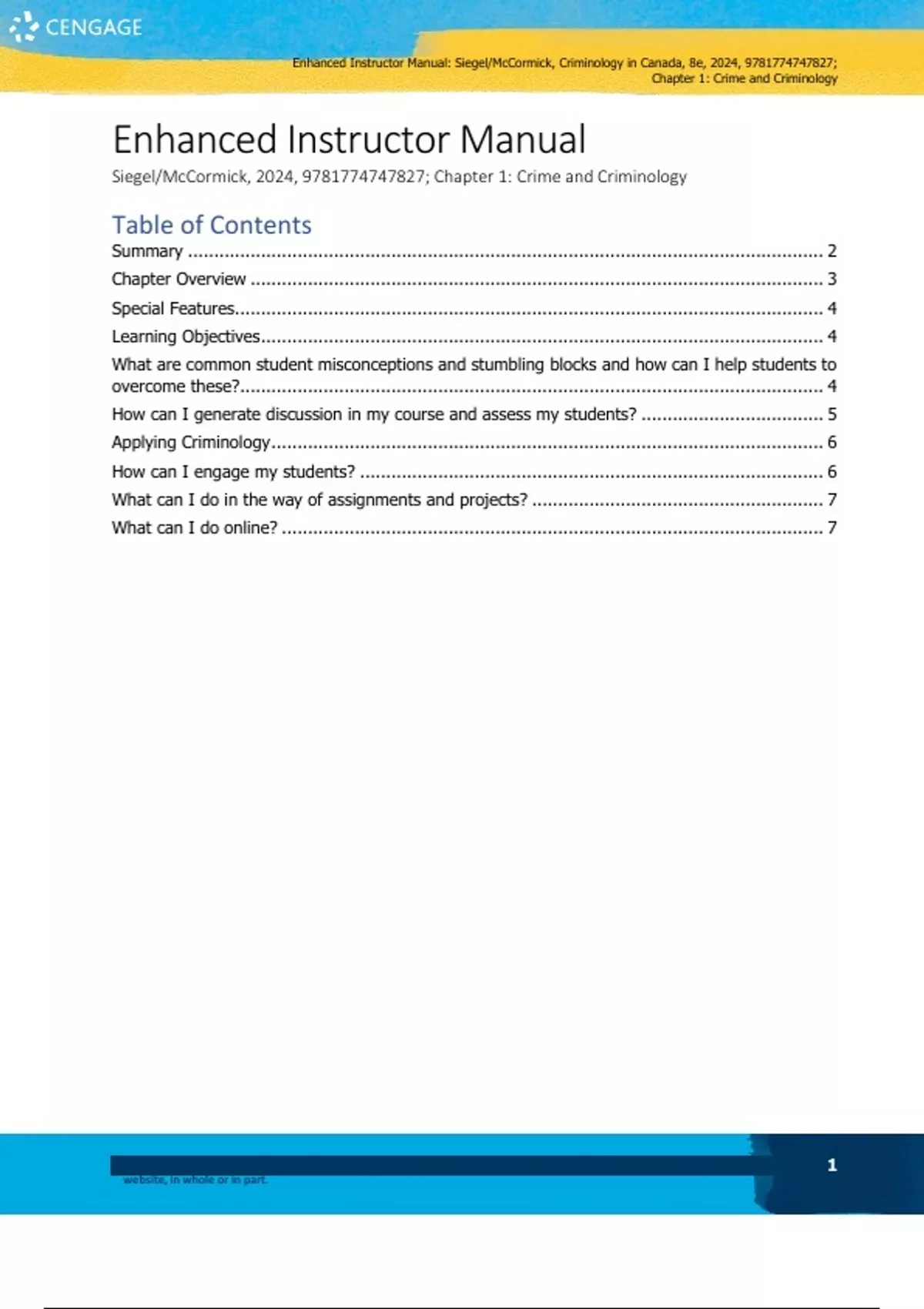 Enhanced Instructor Manual Criminology in Canada, 8th Edition, Siegel, McCormick, 2024