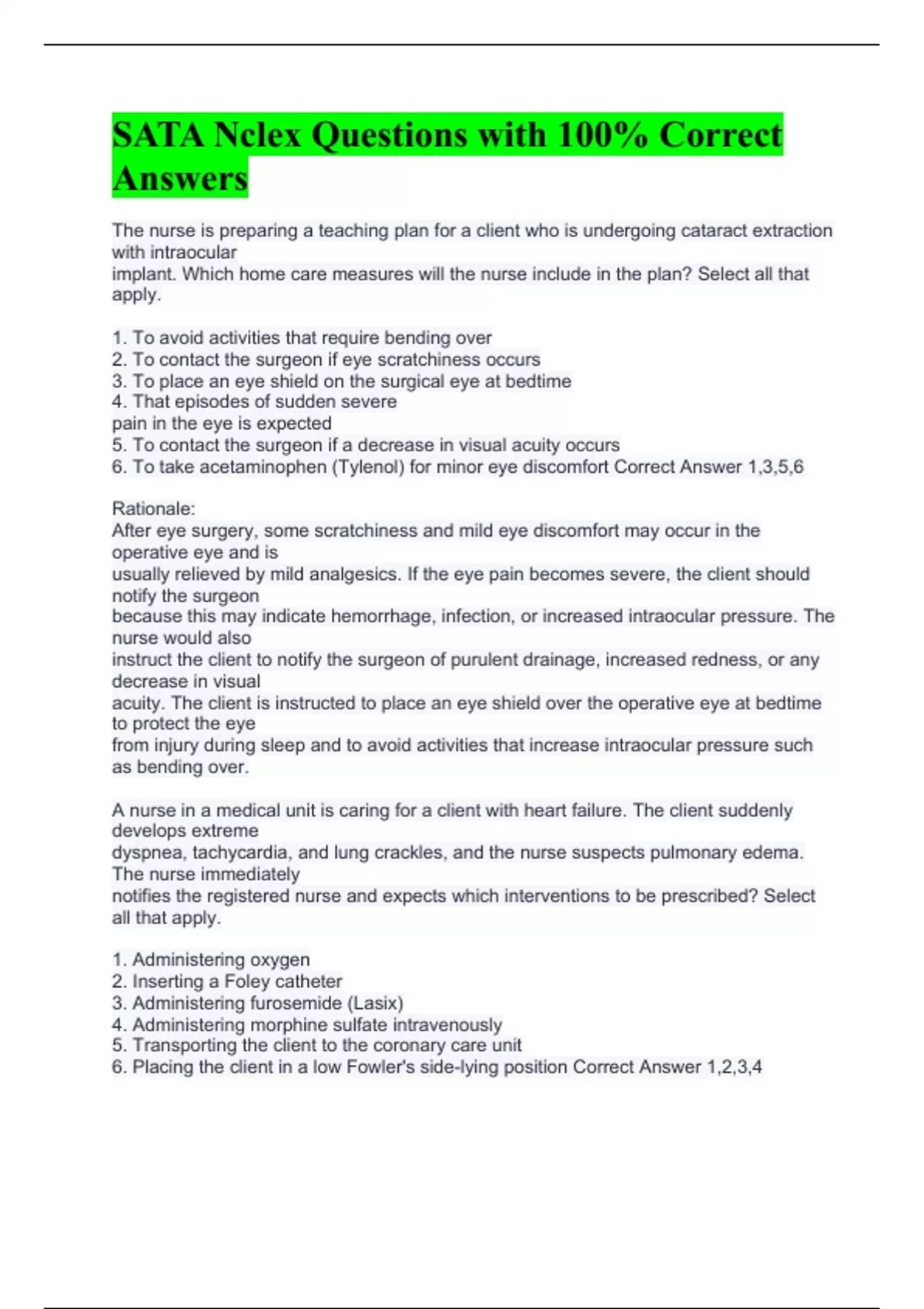 The nurse is preparing a teaching plan for a client who is undergoing cataract extraction with intraocular implant. Which home care measures will the nurse include in the plan? Select all that apply. 1. To avoid activities that require bending over 2. To contact the surgeon if eye scratchiness occurs 3. To place an eye shield on the surgical eye at bedtime 4. That episodes of sudden severe pain in the eye is expected 5. To contact the surgeon if a decrease in visual acuity occurs 6. To take acetaminophen (Tylenol) for minor eye discomfort Correct Answer 1,3,5,6 Rationale: After eye surgery, some scratchiness and mild eye discomfort may occur in the operative eye and is usually relieved by mild analgesics. If the eye pain becomes severe, the client should notify the surgeon because this may indicate hemorrhage, infection, or increased intraocular pressure. The nurse would also instruct the client to notify the surgeon of purulent drainage, increased redness, or any decrease in visual acuity. The client is instructed to place an eye shield over the operative eye at bedtime to protect the eye from injury during sleep and to avoid activities that increase intraocular pressure such as bending over. A nurse in a medical unit is caring for a client with heart failure. The client suddenly develops extreme dyspnea, tachycardia, and lung crackles, and the nurse suspects pulmonary edema. The nurse immediately notifies the registered nurse and expects which interventions to be prescribed? Select all that apply. 1. Administering oxygen 2. Inserting a Foley catheter 3. Administering furosemide (Lasix) 4. Administering morphine sulfate intravenously 5. Transporting the client to the coronary care unit 6. Placing the client in a low Fowler's side-lying position Correct Answer 1,2,3,4 Rationale: Pulmonary edema is a life-threatening event that can result from severe heart failure. In pulmonary edema the left ventricle fails to eject sufficient blood, and pressure increases in the lungs because of the accumulated blood. Oxygen is always prescribed, and the client is placed in a high Fowler's position to ease the work of breathing. Furosemide, a rapid-acting diuretic, will eliminate accumulated fluid. A Foley catheter is inserted to accurately measure output. Intravenously administered morphine sulfate reduces venous return (preload), decreases anxiety, and reduces the work of breathing. Transporting the client to the coronary care unit is not a priority intervention. In fact, this may not be necessary at all if the client's response to treatment is successful A nurse is caring for an infant with a diagnosis of tetralogy of Fallot. The infant suddenly becomes cyanotic and the oxygen saturation reading drops to 60%. Choose the interventions that the nurse should perform. Select all that apply. 1. Call a code blue. 2. Notify the registered nurse. 3. Place the infant in a prone position. 4. Prepare to administer morphine sulfate. 5. Prepare to administer intravenous fluids. 6. Prepare to administer 100% oxygen by face mask. Correct Answer 2,4,5,6 Rationale: The child who is cyanotic with oxygen saturations dropping to 60% is having a hypercyanotic episode. Hypercyanotic episodes often occur among infants with tetralogy of Fallot, and they may occur among infants whose heart defect includes the obstruction of pulmonary blood flow and communication between the ventricles. If a hypercyanotic episode occurs, the infant is placed in a knee-chest position immediately. The registered nurse is notified, who will then contact the health care provider. The knee- chest position improves systemic arterial oxygen saturation by decreasing venous return so that smaller amounts of highly saturated blood reach the heart. Toddlers and children squat to get into this position