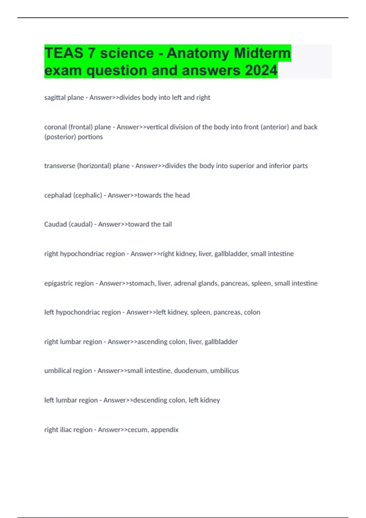 TEAS 7 science - Anatomy Midterm exam question and answers 2024 sagittal plane - Answer>>divides body into left and right coronal (frontal) plane - Answer>>vertical division of the body into front (anterior) and back (posterior) portions transverse (horizontal) plane - Answer>>divides the body into superior and inferior parts cephalad (cephalic) - Answer>>towards the head Caudad (caudal) - Answer>>toward the tail right hypochondriac region - Answer>>right kidney, liver, gallbladder, small intestine