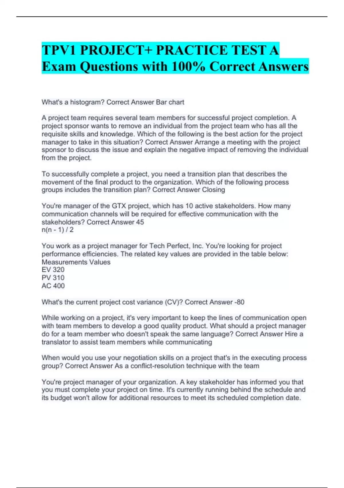 TPV1 PROJECT+ PRACTICE TEST A Exam Questions with 100% Correct Answers
