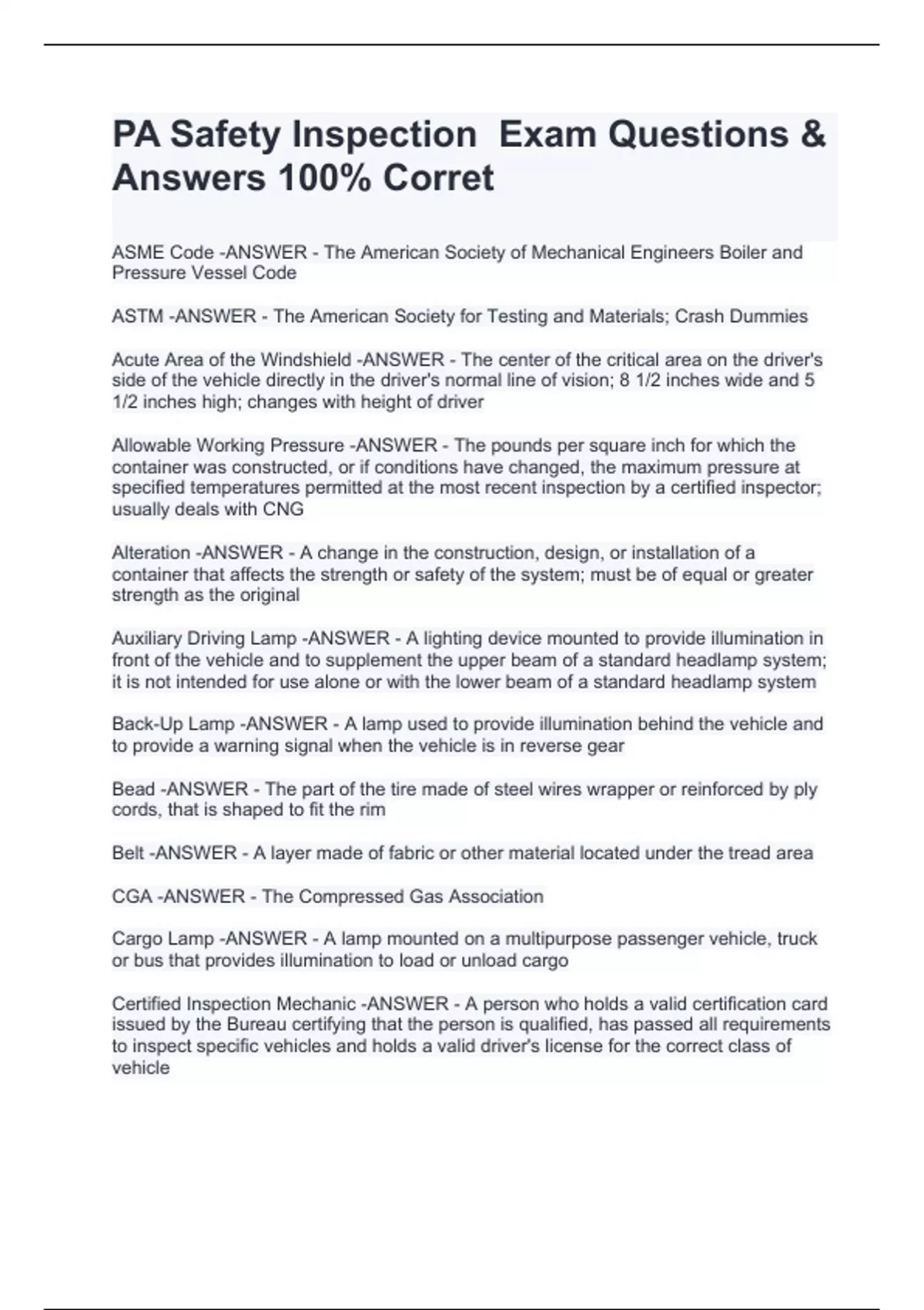 PA Safety Inspection Exam Questions & Answers 100% Corret