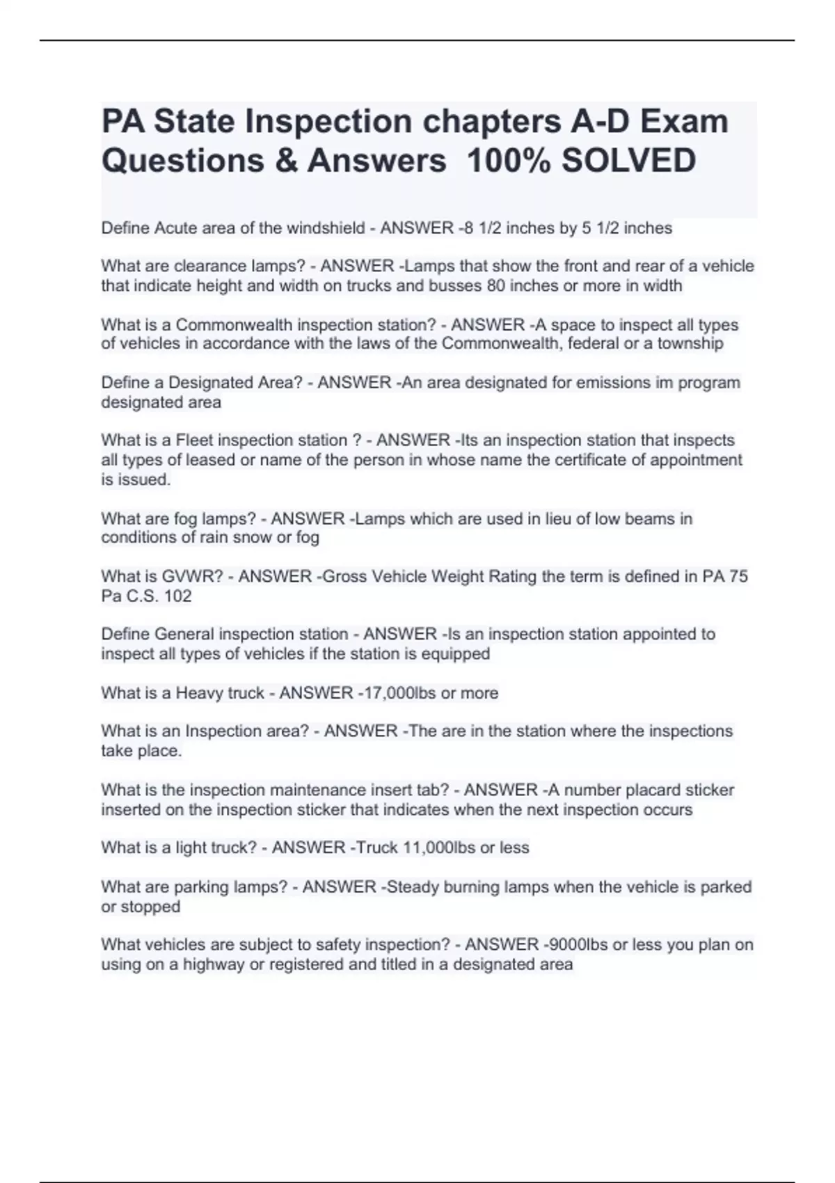 pa state inspection chapters a d exam stuvia