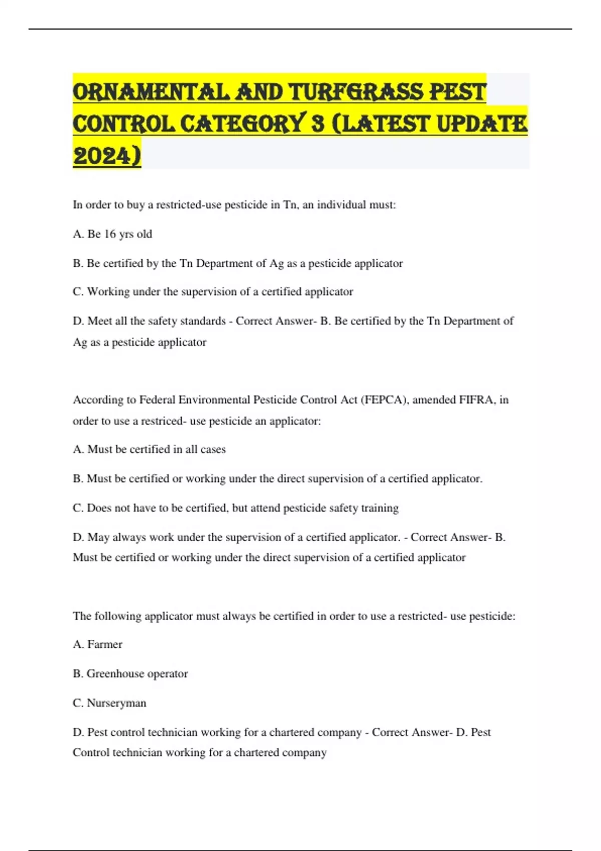 In order to buy a restricted-use pesticide in Tn, an individual must: A. Be 16 yrs old B. Be certified by the Tn Department of Ag as a pesticide applicator C. Working under the supervision of a certified applicator D. Meet all the safety standards - Correct Answer- B. Be certified by the Tn Department of Ag as a pesticide applicator According to Federal Environmental Pesticide Control Act (FEPCA), amended FIFRA, in order to use a restriced- use pesticide an applicator: A. Must be certified in all cases B. Must be certified or working under the direct supervision of a certified applicator. C. Does not have to be certified, but attend pesticide safety training D. May always work under the supervision of a certified applicator. - Correct Answer- B. Must be certified or working under the direct supervision of a certified applicator The following applicator must always be certified in order to use a restricted- use pesticide: A. Farmer B. Greenhouse operator C. Nurseryman D. Pest control technician working for a chartered company - Correct Answer- D. Pest Control technician working for a chartered company When does a private applicator become a commercial applicator? A. When he/she exchange services for another private applicator B. When he/she sprays for another individual and charges a fee C. When he/ she sprays within a greenhouse D. When their income exceeds $25,000 - Correct Answer- B. When he/she sprays for another individual and charges a fee The examination fee for a commercial applicator is: A. $5 B. $10 C. $15 D. $20 - Correct Answer- C. $15 Commercial applicators may become re certified by: A. Paying $15 annually B. Sending an application to TDA C. Earning a certain number of re certification points during the designated period D. Attending a re certification meeting during the last year of the re certification period - Correct Answer- C. Earning a certain number of re certification points during the designated period Commercial applicators who violate any provision of FIFRA may be fined: A. Civil penalty of $5,000 for each offense; Criminal penalty of $25,000 or one year in prison B. Civil penalty of $1,000 for each offense; Criminal penalty of $5,000 or one year in prison Civil penalty of $5,000 for each offense; Criminal penalty of $100,000 D. None of the above - Correct Answer- A. Civil penalty of $5,000 for each offense; Criminal penalty of $25,000 or one year in prison Commercial applicators must keep records of: A. General-use pesticides B. Restricted-use pesticides C. General and Restricted-use pesticides D. Pesticides with skull and cross bones - Correct Answer- C. General and Restricted-use