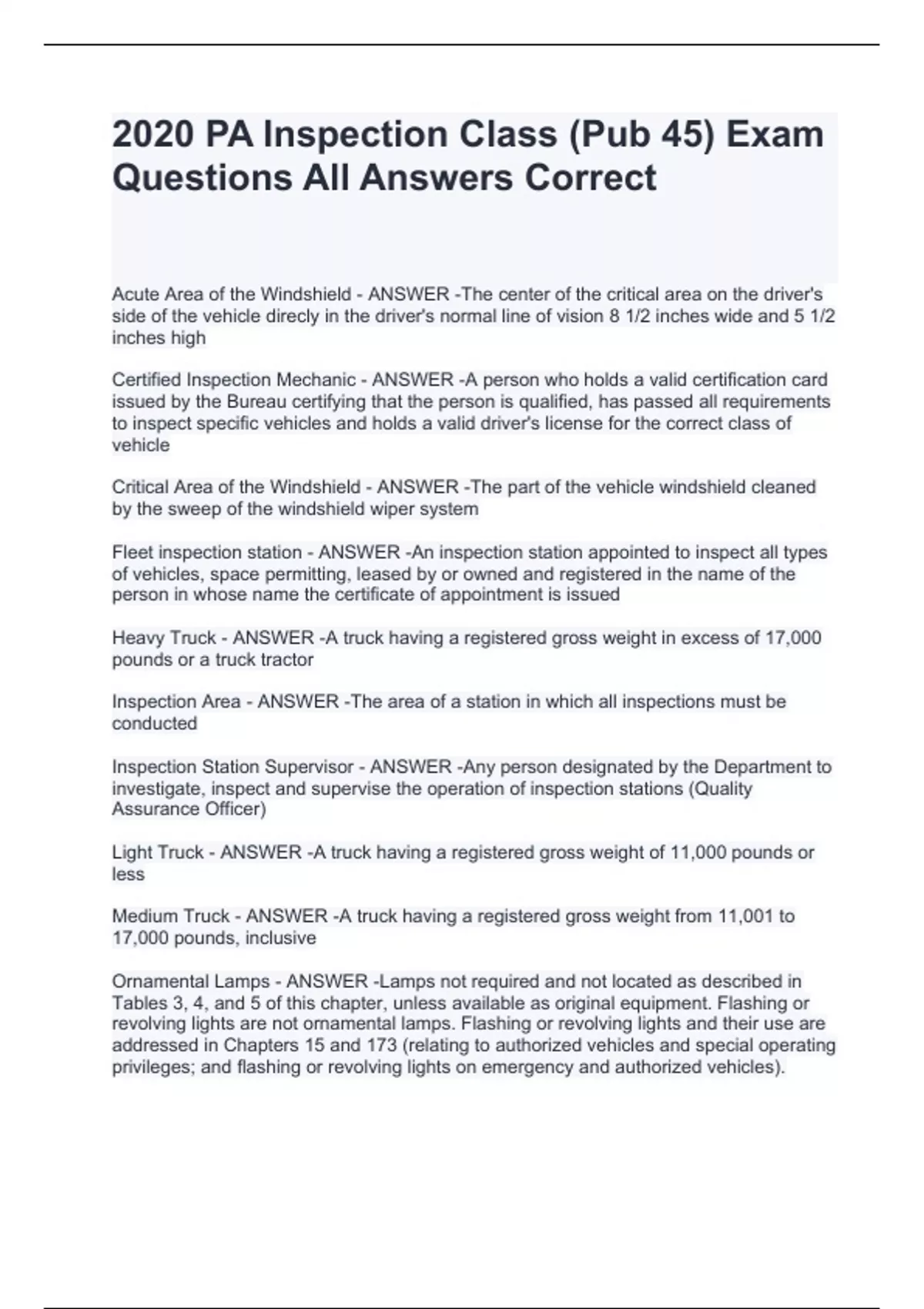 2020 PA Inspection Class (Pub 45) Exam Questions All Answers Correct