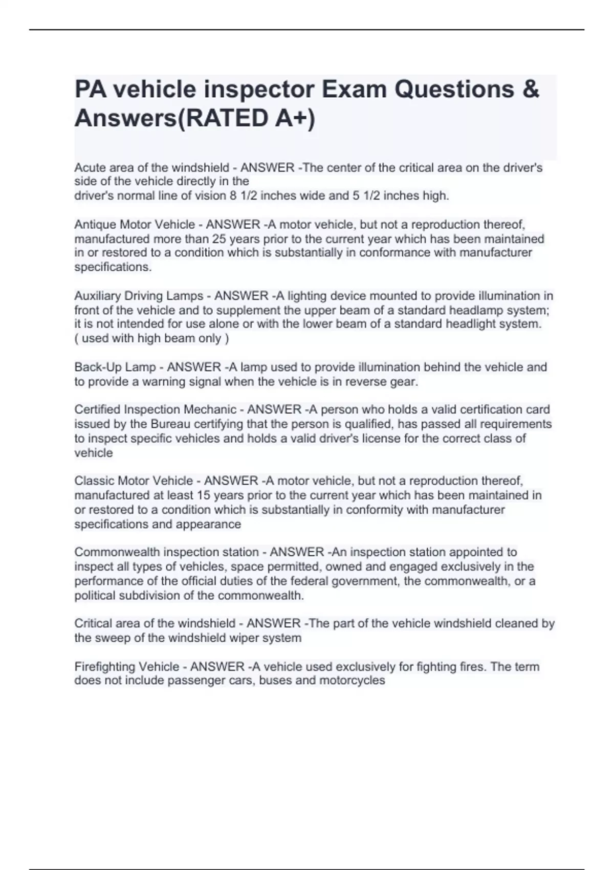 Antique Motor Vehicle - ANSWER -A motor vehicle, but not a reproduction thereof, manufactured more than 25 years prior to the current year which has been maintained in or restored to a condition which is substantially in conformance with manufacturer specifications. Auxiliary Driving Lamps - ANSWER -A lighting device mounted to provide illumination in front of the vehicle and to supplement the upper beam of a standard headlamp system; it is not intended for use alone or with the lower beam of a standard headlight system. ( used with high beam only ) Back-Up Lamp - ANSWER -A lamp used to provide illumination behind the vehicle and to provide a warning signal when the vehicle is in reverse gear. Certified Inspection Mechanic - ANSWER -A person who holds a valid certification card issued by the Bureau certifying that the person is qualified, has passed all requirements to inspect specific vehicles and holds a valid driver's license for the correct class of vehicle Classic Motor Vehicle - ANSWER -A motor vehicle, but not a reproduction thereof, manufactured at least 15 years prior to the current year which has been maintained in or restored to a condition which is substantially in conformity with manufacturer specifications and appearance Commonwealth inspection station - ANSWER -An inspection station appointed to inspect all types of vehicles, space permitted, owned and engaged exclusively in the performance of the official duties of the federal government, the commonwealth, or a political subdivision of the commonwealth. Critical area of the windshield - ANSWER -The part of the vehicle windshield cleaned by the sweep of the windshield wiper system Firefighting Vehicle - ANSWER -A vehicle used exclusively for fighting fires. The term does not include passenger cars, buses and motorcycles
