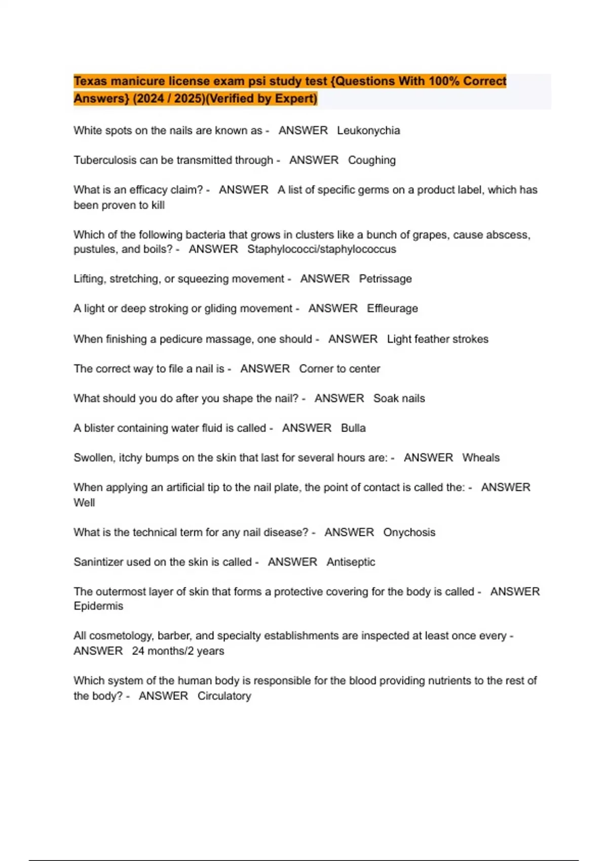 Texas manicure license exam psi study test {Questions With 100% Correct Answers} (2024 / 2025)(Verified by Expert)