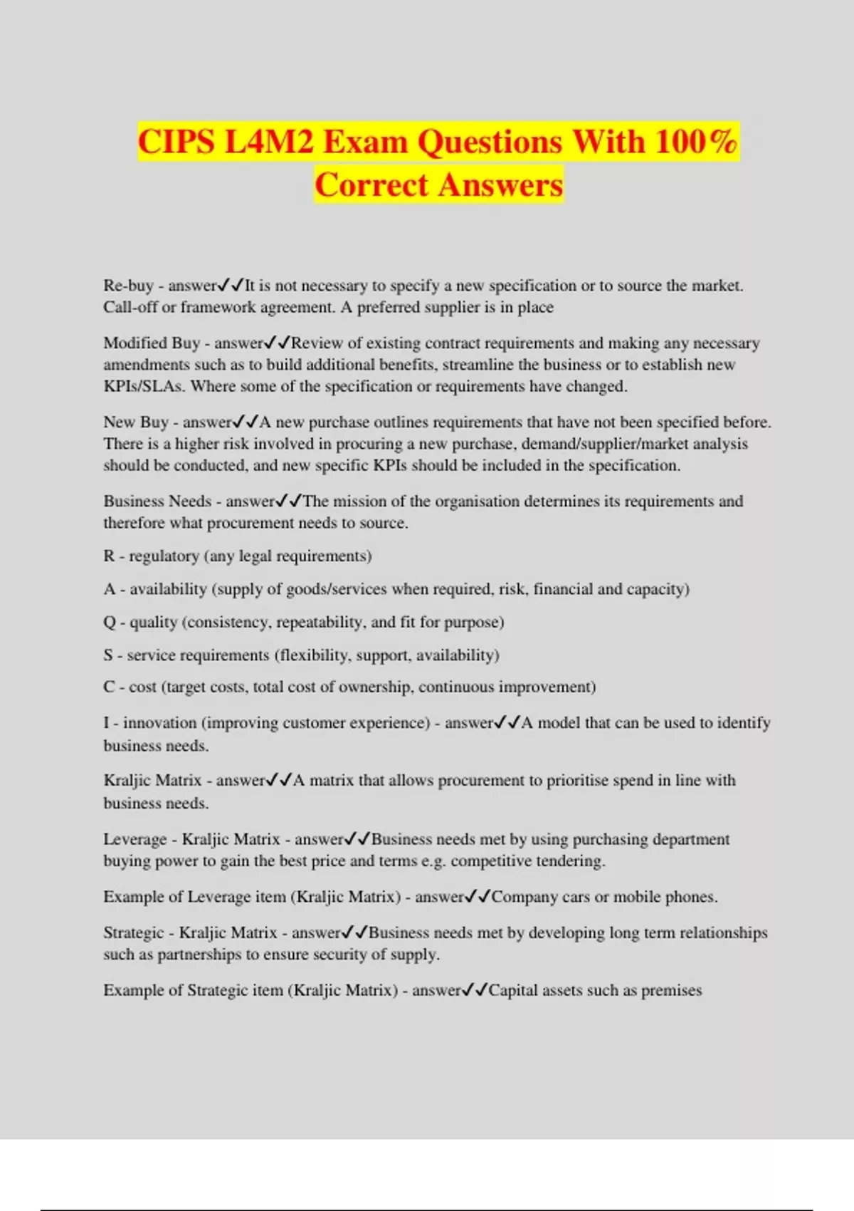 CIPS L4M2 Exam Questions With 100% Correct Answers Re-buy - answerIt is not necessary to specify a new specification or to source the market. Call-off or framework agreement. A preferred supplier is in place Modified Buy - answerReview of existing contract requirements and making any necessary amendments such as to build additional benefits, streamline the business or to establish new KPIs/SLAs. Where some of the specification or requirements have changed. New Buy - answerA new purchase outlines requirements that have not been specified before. There is a higher risk involved in procuring a new purchase, demand/supplier/market analysis should be conducted, and new specific KPIs should be included in the specification. Business Needs - answerThe mission of the organisation determines its requirements and therefore what procurement needs to source. R - regulatory (any legal requirements) A - availability (supply of goods/services when required, risk, financial and capacity) Q - quality (consistency, repeatability, and fit for purpose) S - service requirements (flexibility, support, availability) C - cost (target costs, total cost of ownership, continuous improvement) I - innovation (improving customer experience) - answerA model that can be used to identify business needs. Kraljic Matrix - answerA matrix that allows procurement to prioritise spend in line with business needs. Leverage - Kraljic Matrix - answerBusiness needs met by using purchasing department buying power to gain the best price and terms e.g. competitive tendering. Example of Leverage item (Kraljic Matrix) - answerCompany cars or mobile phones. Strategic - Kraljic Matrix - answerBusiness needs met by developing long term relationships such as partnerships to ensure security of supply. Example of Strategic item (Kraljic Matrix) - answerCapital assets such as premises Routine - Kraljic Matrix - answerBusiness needs met by trying to buy these more efficiently through blanket ordering, e-procurement and vendor managed inventory leadership in procurement and supply. Example of Routine item (Kraljic Matrix) - answerStationary Bottleneck - Kraljic Matrix - answerBusiness needs met by developing appropriate contracts (such as call off contracts, framework agreements) in which the buyer can ensure that stock levels and maintained and speed of re-ordering. Example of Bottleneck item (Kraljic Matrix) - answerSpare parts or oil for machines Cost and risk - Kraljic Matric - answerLow cost / high risk - Bottleneck High cost / high risk - Strategic High cost / low risk - Leverage Low cost / low risk - Routine Total cost of ownership - answerIs how much it costs to own the product over its lifetime until disposal. Whole life costing - answerIs a technique used to arrive at the total cost of ownership Planning, preparation and implementation - answerThree stages of WLC WLC - planning - answerDetermines the budget for the asset being purchased, helps improve the specification to reduce cost, and simulation or decision support models can be used to assist. WLC - preparation - answerTesting the various models for calculating WLC and is necessary to choose the best model. WLC - implementation - answerImplements the model to get the results. A review and intervals for regular recalculation. Acquisition, operation and disposal - answerThere is a vital difference between purchase price and total cost of ownership. This includes 3 categories. Cost based pricing - answerAllows the supplier to cover its costs and make a profit. Limits to cost based pricing - answerIgnores competition and other influences on pricing and are quite inflexible. They also don't give a supplier an incentive to reduce or manage costs. Cost behaviour - answerThe way in which costs of outputs are affected by fluctuations in the level of activity. Open book costing - answerThe supplier provides the buyer with information about their costs to be scrutinised e.g. reassures there is VFM, facilitates cost based pricing. Costing methods - answerMarginal, absorption, activity based Marginal costing method - answerIs widely used by managers and is useful in the distinction between variable costs and fixed costs. Variable costs are always the relevant costs in terms of decision making. Absorption costing method - answerThe challenge is to attribute a 'fair' amount of fixed costs to each unit of production output. Traditionally this has been done by determining the amount of some measurable resource consumed in a production period and the overheads of that resource. Activity based costing method - answerThis is based on the identification of cost drivers and cost pools. There is a difference between purchase price and total cost of ownership. Best value = the lowest whole life cost. Profit - answerThe difference between the selling price of a product and the cost of producing the product. Cash flow forecast - answerIs designed to identify the sources and amounts of cash inflows, and the destinations and amount of cash outflows, over a given budgetary period. Cash flow projection - answerDesigned to project the future cash position of the firm or project. Cash flow management - answerEnsuring that we time incoming and outgoing cash flows. Business case - answerIs the justification for undertaking an action and its purpose is to seek approval and finance for the recommended action. Companies will use a substitute product/service if the economics of doing so are favourable. This depends on 3 things: - answerThe relationship between the value the org gets from the product and it's price, how costly the change would be, and the inclination of the buyer to make a change. Line of best fit - answerThe line that goes approx. through the middle of the data points with an equal number of data points above and below it. Open-ended problems - answerWhen something is stopping the achievement of an objective or blocking progress e.g. agreement from senior management is required before progressing. Cl
