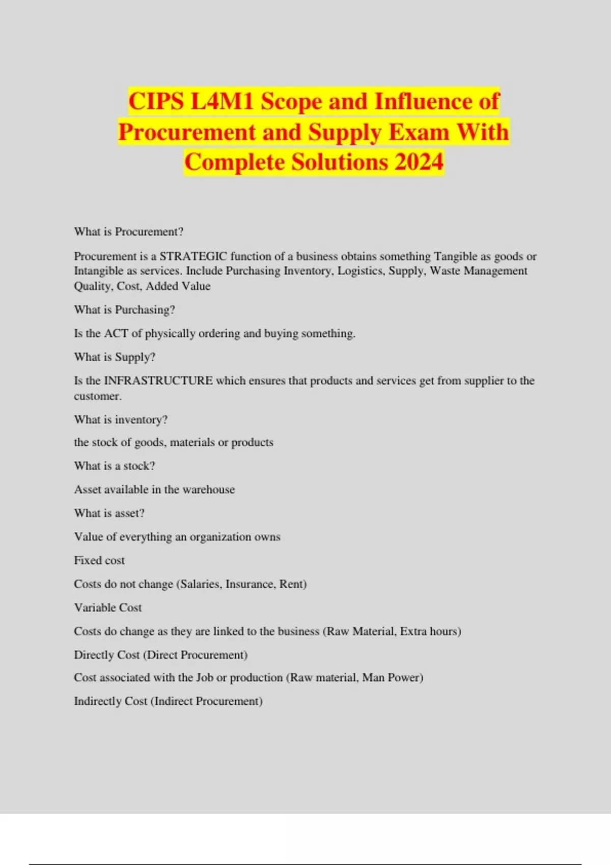CIPS L4M1 Scope and Influence of Procurement and Supply Exam With Complete Solutions 2024 What is Procurement? Procurement is a STRATEGIC function of a business obtains something Tangible as goods or Intangible as services. Include Purchasing Inventory, Logistics, Supply, Waste Management Quality, Cost, Added Value What is Purchasing? Is the ACT of physically ordering and buying something. What is Supply? Is the INFRASTRUCTURE which ensures that products and services get from supplier to the customer. What is inventory? the stock of goods, materials or products What is a stock? Asset available in the warehouse What is asset? Value of everything an organization owns Fixed cost Costs do not change (Salaries, Insurance, Rent) Variable Cost Costs do change as they are linked to the business (Raw Material, Extra hours) Directly Cost (Direct Procurement) Cost associated with the Job or production (Raw material, Man Power) Indirectly Cost (Indirect Procurement) Not associated with the Job (Clean Liquid, Stationary, Mobile phones contracts, MRO - Maintenance repairs and Operations. Primary Sector of the Economy The part of the economy that draws raw materials from the natural environment (Cotton, Oil, Silver, Wheat) Secondary sector of the Economy The part of the economy that transforms raw materials into manufactured goods (Light Bulbs, Nuts and Bolts, Metal housing, Plastic fittings) Finished goods Units of products that have been completed but not yet sold to customers (Shoes, Beds, Clothes, Jewellery) Stock Procurement Includes Can be stored and inventory Raw Material, Components and Finished Goods. Non-Stock Procurement Includes Are not stored and not listed in the Organization inventory (Cleaning Services, Internet Contract, Insurances, Advertising Campaigns) Explain why the procurement department should be consulted before an organization spends money. Procurement can influence the majority of the costs within an organization: 1.- Evaluating potential suppliers 2.- Involved in preparing specifications 3.- Review Quality standards 4.- Assess ethical requirements 5.- Compare buy or lease options 6.- Investigate transport 7.- Review packing options. 8.- Research total life cost 9.- Calculate currency differences 10.- Benchmark prices 11.- Ensure assets are fit for a propose Total life Cost (TLC) The total amount a product will cost an organization. Mentioned some examples of NON-STOCK INTANGIBLE procurements. Insurance, Marketing, Salaries/Pensions, Cleaning, IT and Catering Services, Staff Development, Electricity, Gas, Rent or Mortage. Mentioned some examples of STOCK TANGIBLE procurements. Components, Stationary, Uniforms Mentioned some examples of CAPITAL NON-STOCK TANGIBLE procurements. Machinery, Buildings, Lands, Vehicles CapEx (Capital Expenditure) The cost associated to assets of an Organization (The value of a Capital Purchases reduce overtime, the amount of the asset depreciated) OPEX (Operating Expenditure) Cost Associated with the running of an Organization, such as electricity, labour, transport, rent, the raw material (Day to day running of the business) What is a budget? Financial plan for a set period on how much can spend money. Depreciation The reduction overtime in the value of an asset held by the company. What should a procurement professional consider when sourcing a capital purchase? The TCL - Total Cost of Life, Depreciation. Procurement Process A cross-functional business process that originates when a company needs to acquire goods or services from external sources, and it concludes when the company receives and pays for them. What are the stages of the procurement cycle process? 1.-Understand the need 2.- Market/commodity 3.- Develop a strategy 4.- Pre procure 5.- Develop Documentation 6.- Supplier Selection 7.- ITT/RFQ 8.- BID/TENDER 9.- Contract Award 10.- Warehouse Logistics 11.- Contract Performance