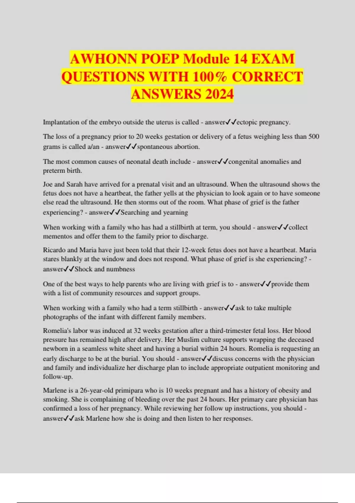 AWHONN POEP Module 14 EXAM QUESTIONS WITH 100% CORRECT ANSWERS 2024 Implantation of the embryo outside the uterus is called - answerectopic pregnancy. The loss of a pregnancy prior to 20 weeks gestation or delivery of a fetus weighing less than 500 grams is called a/an - answerspontaneous abortion. The most common causes of neonatal death include - answercongenital anomalies and preterm birth. Joe and Sarah have arrived for a prenatal visit and an ultrasound. When the ultrasound shows the fetus does not have a heartbeat, the father yells at the physician to look again or to have someone else read the ultrasound. He then storms out of the room. What phase of grief is the father experiencing? - answerSearching and yearning When working with a family who has had a stillbirth at term, you should - answercollect mementos and offer them to the family prior to discharge. Ricardo and Maria have just been told that their 12-week fetus does not have a heartbeat. Maria stares blankly at the window and does not respond. What phase of grief is she experiencing? - answerShock and numbness One of the best ways to help parents who are living with grief is to - answerprovide them with a list of community resources and support groups. When working with a family who had a term stillbirth - answerask to take multiple photographs of the infant with different family members. Romelia's labor was induced at 32 weeks gestation after a third-trimester fetal loss. Her blood pressure has remained high after delivery. Her Muslim culture supports wrapping the deceased newborn in a seamless white sheet and having a burial within 24 hours. Romelia is requesting an early discharge to be at the burial. You should - answerdiscuss concerns with the physician and family and individualize her discharge plan to include approp