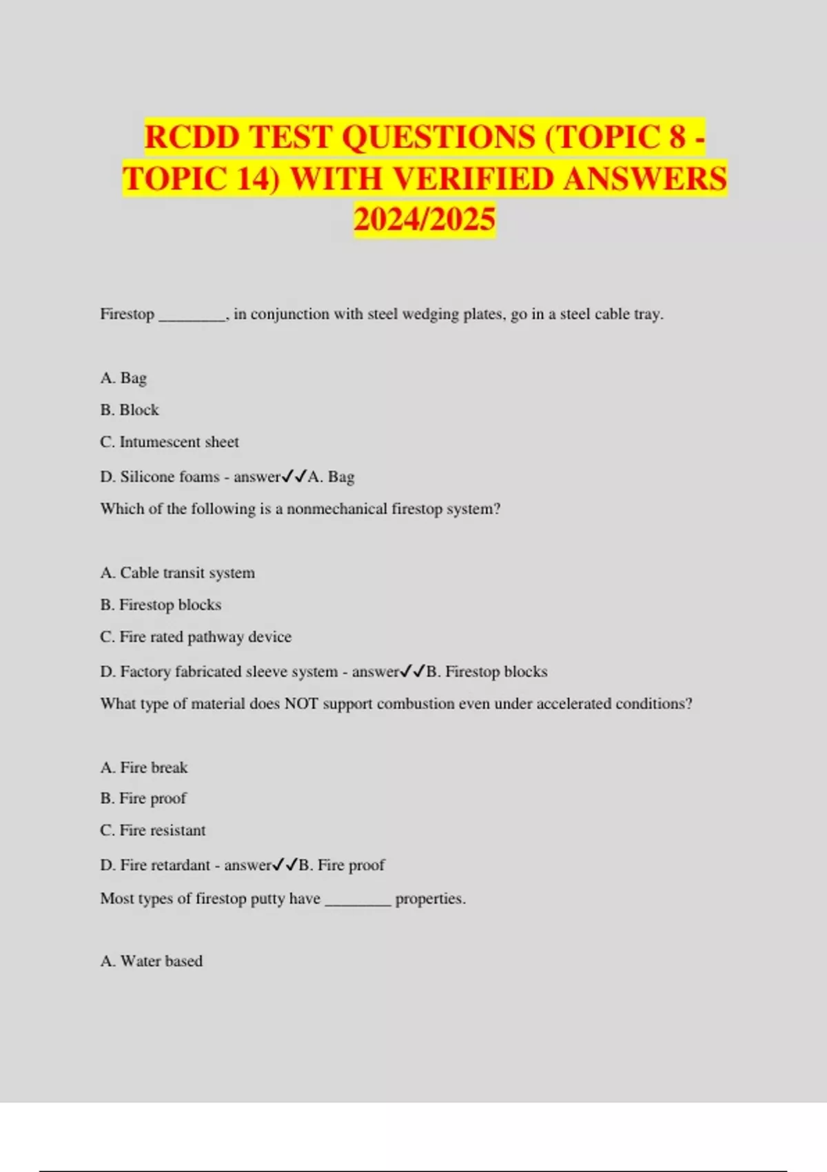 RCDD TEST QUESTIONS (TOPIC 8 - TOPIC 14) WITH VERIFIED ANSWERS 2024/2025 Firestop ________, in conjunction with steel wedging plates, go in a steel cable tray. A. Bag B. Block C. Intumescent sheet D. Silicone foams - answerA. Bag Which of the following is a nonmechanical firestop system? A. Cable transit system B. Firestop blocks C. Fire rated pathway device D. Factory fabricated sleeve system - answerB. Firestop blocks What type of material does NOT support combustion even under accelerated conditions? A. Fire break B. Fire proof C. Fire resistant D. Fire retardant - answerB. Fire proof Most types of firestop putty have ________ properties. A. Water based B. Cementitious C. Intumescent D. Silicone based - answerC. Intumescent A ________ eliminates the need to remove or install materials. A. Cast-in-place device B. Cable transit system C. Fire-rated pathway device D. Factory fabricated sleeve system - answerC. Fire-rated pathway device You are designing the cabling infrastructure for a lab office building that will frequently change tenants. The owner will be responsible for all of the infrastructure that feeds each floor to include the telecommunication rooms. Which firestop method will best suit the owners needs? A. Cable transit system B. Factory fabricated sleeve system C. Firestop pillow system D. Silicone foam system - answerC. Firestop pillow system Cementitious materials are ________ based materials. A. Dry powder B. Latex C. Solvent D. Sand - answerA. Dry powder A fire ________ is a contained area that is completely enclosed by fire resistant walls, floors, and ceilings. A. Rated system B. Stop system C. Wall D. Zone - answerD. Zone You are designing a cabling system for a chemical plant. What type of device is needed to prevent the spread of fire along the cable other than the barrier penetrations? A. Fire break B. Fire shield C. Fire stop D. Fire wall - answerA. Fire break You are designing a firestop system for a boiler room that will have conduits coming from the service provider maintenance hole into the building. Which test rating will address the firestops ability to resist breakdown from water damage? A. F rating B. L rating C. T rating D. W rating - answerD. W rating You are designing a firestop system for a hospital with several floors that have isolation rooms. Air leakage control is important to ensure rooms are sealed and restrict the spread of disease. Which firestop test rating should you use to ensure air leakage compliance? A. F rating B. L rating C. T rating D. W rating - answerB. L rating The F rating for a framed wall/stud wall is ________ hour(s). A. One B. Two C. Three D. Four - answerB. Two A(n) ________ system is considered a mechanical firestop. A. Cementitious - B. Cable transit - C. Firestop block - D. Intumescent sheet - - answerB. Cable transit - As a guide, the MAXIMUM recommended DC current value on any bonded conductor should be less than: A. 250 milliamps B. 500 milliamps C. 750 milliamps D. 1 amp E. 1.25 amps - answerB. 500 milliamps Surge currents due to lightning and other sources MUST be ________ before they penetrate the infrastructure. A. Shorted B. Maximized C. Terminated D. Equalized - answerD. Equalized The impedance of the equipment grounding conductor can only be accurately measured with an instrument known as a(n): A. Volt ohm meter B. Power distribution unit C. Exothermic weld connection D. Ground impedance tester