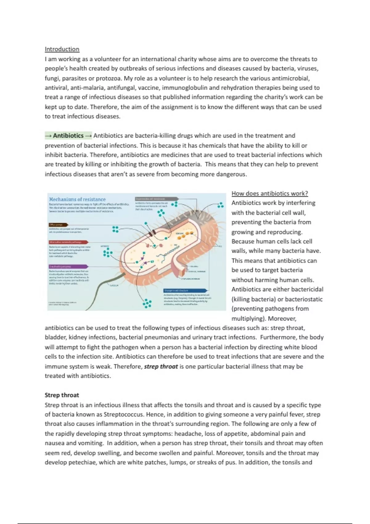 This assignment provides a detailed overview of methods for treating infectious diseases, including specific treatments like antibiotics, antivirals, and rehydration therapy. It also addresses factors affecting access and acceptance of treatment, such as social barriers and cultural beliefs. The thorough coverage of these topics has earned it a Distinction* grade, showcasing its comprehensive and detailed nature.