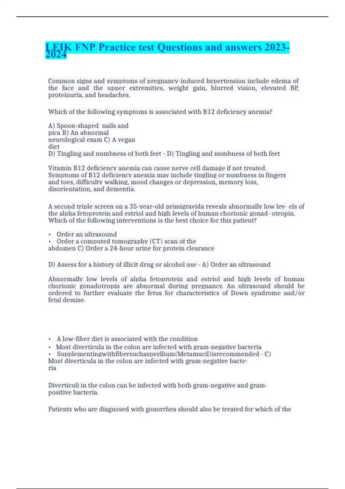 LEIK FNP Practice test Questions and answers Common signs and symptoms of pregnancy-induced hypertension include edema of the face and the upper extremities, weight gain, blurred vision, elevated BP, proteinuria, and headaches. Which of the following symptoms is associated with B12 deficiency anemia? A) Spoon-shaped nails and pica B) An abnormal neurological exam C) A vegan diet D) Tingling and numbness of both feet - D) Tingling and numbness of both feet Vitamin B12 deficiency anemia can cause nerve cell damage if not treated. Symptoms of B12 deficiency anemia may include tingling or numbness in fingers and toes, difficulty walking, mood changes or depression, memory loss, disorientation, and dementia. A second triple screen on a 35-year-old primigravida reveals abnormally low lev- els of the alpha fetoprotein and estriol and high levels of human chorionic gonad- otropin. Which of the following interventions is the best choice for this patient? Order an ultrasound Order a computed tomography (CT) scan of the abdomen C) Order a 24-hour urine for protein clearance D) Assess for a history of illicit drug or alcohol use - A) Order an ultrasound Abnormally low levels of alpha fetoprotein and estriol and high levels of human chorionic gonadotropin are abnormal during pregnancy. An ultrasound should be ordered to further evaluate the fetus for characteristics of Down syndrome and/or fetal demise. A low-fiber diet is associated with the condition Most diverticula in the colon are infected with gram-negative bacteria Supplementingwithfibersuchaspsyllium(Metamucil)isrecommended - C) Most diverticula in the colon are infected with gram-negative bacte- ria Diverticuli in the colon can be infected with both gram-negative and gram- positive bacteria. Patients who are diagnosed with gonorrhea should also be treated for which of the following infections? Chancroid Chlamydia trachomatis C) Herpes genitalis D) PID (pelvic inflammatory disease) - B) Chlamydia trachomatis When diagnosed with gonorrhea, the patient should also be treated for Chlamydia trachomatis. Kyphosis is a late sign of: Old age Osteopenia C) Osteoporosis D) Osteoarthritis - C) Osteoporosis Kyphosis is a curvature of the spine that causes a rounding of the back, which leads to a slouching posture. Severe thinning of the bones (osteoporosis) contributes to this curvature in the spine. Symptoms that may occur with severe cases of kyphosis include difficulty breathing, fatigue, and back pain.A 72-year-old woman has been on hydrochlorothiazide 12.5 mg for many years to control her Stage II hypertension. Her blood pressure (BP) at this visit is 168/96. She is currently complaining of pain on her right hip and on both knees. She has increased her dose of ibuprofen (Motrin) from 400 mg 3 times day (TID) to 800 mg TID. She is still in pain and would like something stronger. Which of the following statements is the best explanation of the effects of ibuprofen (Motrin) on her disease? It increases the chances of adverse effects to her health It inhibits the effect of renal prostaglandins and blunts the effectiveness of the diuretic C) It prolongs the therapeutic effects of hydrochlorothiazide and other diuretics D) None of the statements are true - B) It inhibits the effect of renal prostaglandins and blunts the effectiveness of the diuretic. NSAIDs and ASA inhibit the vasodilatory effects of prostaglandins, which predisposes the kidney to ischemia. NSAIDs and diuretics can cause acute prerenal failure by decreasing renal blood flow. 2. All of the following are infections that affect mostly the labia and vagina except: A) Bacterialvaginosis B) Candidiasis Trichomoniasis Chlamydia trachomatis - D) Chlamydia trachomatis Infections that commonly affect the labia and vagina include bacterial vaginosis, candidiasis, and trichomoniasis. Chlamydia trachomatis commonly affects the cervix, endometrial lining , fallopian tubes, and pelvic cavity. The nurse practitioner would test the obturator and iliopsoas muscle to evaluate for:
