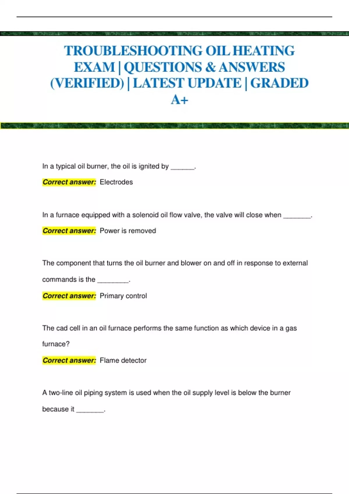 TROUBLESHOOTING OIL HEATING EXAM | QUESTIONS & ANSWERS (VERIFIED) | LATEST UPDATE | GRADED A+