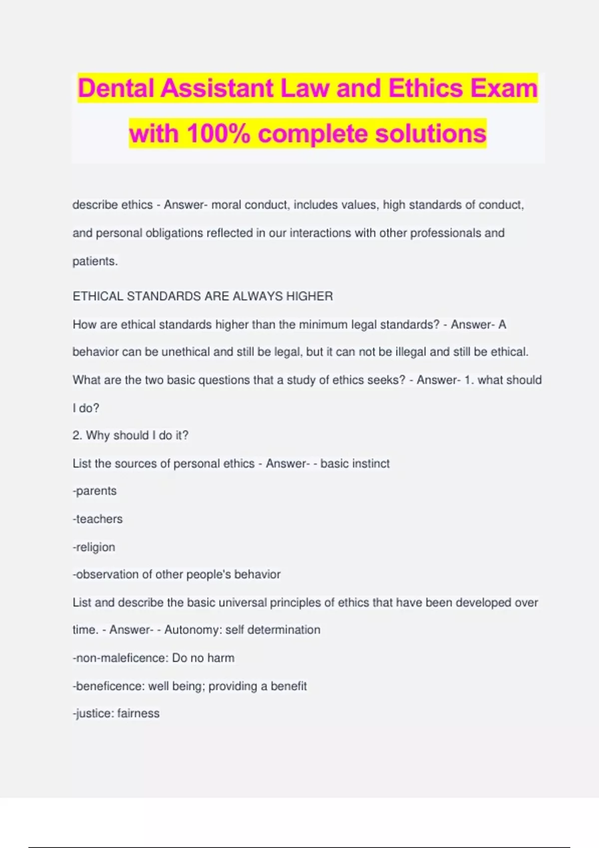 Dental Assistant Law and Ethics Exam with 100% complete solutions describe ethics - Answer- moral conduct, includes values, high standards of conduct, and personal obligations reflected in our interactions with other professionals and patients. ETHICAL STANDARDS ARE ALWAYS HIGHER How are ethical standards higher than the minimum legal standards? - Answer- A behavior can be unethical and still be legal, but it can not be illegal and still be ethical. What are the two basic questions that a study of ethics seeks? - Answer- 1. what should I do? 2. Why should I do it? List the sources of personal ethics - Answer- - basic instinct -parents -teachers -religion -observation of other people's behavior List and describe the basic universal principles of ethics that have been developed over time. - Answer- - Autonomy: self determination -non-maleficence: Do no harm -beneficence: well being; providing a benefit -justice: fairness -confidentiality: not releasing patient's personal information -veracity: to tell the truth what are some examples of the rights of the dental patient regarding their self determination - Answer- patients have the right to make decisions on dental care, as well as refuse treatment what is the basic element in morality - Answer- Do no harm how might the dental healthcare worker demonstrate beneficence? - Answer- volunteering in dental health education programs describe the dental philosophy that will demonstrate a regard for justice in treating dental patients - Answer- all patients should receive quality dental care what may threaten the trust between the patient and the dentist? - Answer- Giving the patient incomplete information is respecting a patient's privacy a legal or ethical obligation? - Answer- BOTH what are the legal requirements regarding suspected child or elder abuse? - Answer- must be reported to protect the individuals from harm what law was enacted in 1996 to put forth very definite legal requirements related to confidentiality of patient's health information? - Answer- HIPAA-- health insurance portability and accountability act what is required by DANB for dental assistants to remain certified and is required by states that license or register dental assistant as part of the renewal process, explain? - Answer- continuing education programs in order to keep the dental assistant up on their skills what are the options for obtaining continuing education? - Answer- - professional association meetings -home study courses/ online what establishes a guide to professional behavior? - Answer- code of ethics what professional organization has developed a written code of ethics for dental assistants - Answer- american dental assistants association why do professional organizations establish a code of ethics? - Answer- - demonstrate a standard of care - enhance ethical consciousness and responsibility - guide members in making informed ethical decisions - establish a standard of professional judgement REVIEW THE EXAMPLES THAT APPLY THE ETHICAL PRINCIPLES page 30 - Answer- what is an ethical dilemma? - Answer- when one or more ethical principles are in conflict what are the steps for solving an ethical dilemma? - Answer- -identify the alternatives -determine professional implications - rank alternatives - choose course of actions if as employed as a dental assistant your dentist/employer's conduct violates ethical standards, what questions should you consider? - Answer- - Do you want to remain at your job under the circumstances? -should you discuss the situation with the employer? - should you seek other employment - will it affect you in the future with other employers what is a statutory law? - Answer- a legislation that congress has passed what are the two types of statutory law? - Answer- 1. criminal law 2. civil law which of the two categories of statutory law involves crime against society and seeks to punish the offender? - Answer- criminal law