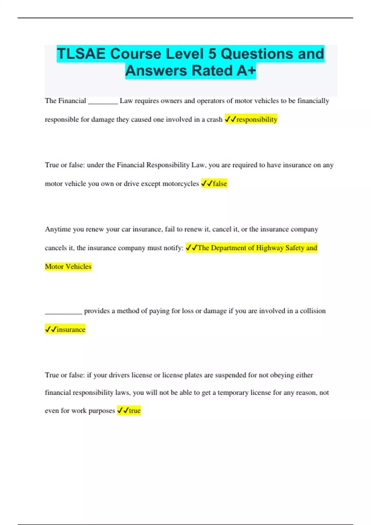 TLSAE Course Level 5 Questions and Answers Rated A+ The Financial ________ Law requires owners and operators of motor vehicles to be financially responsible for damage they caused one involved in a crash responsibility True or false: under the Financial Responsibility Law, you are required to have insurance on any motor vehicle you own or drive except motorcycles false Anytime you renew your car insurance, fail to renew it, cancel it, or the insurance company cancels it, the insurance company must notify: The Department of Highway Safety and Motor Vehicles __________ provides a method of paying for loss or damage if you are involved in a collision insurance True or false: if your drivers license or license plates are suspended for not obeying either financial responsibility laws, you will not be able to get a temporary license for any reason, not even for work purposes true The two motor vehicle insurance laws in Florida are the Financial Responsibility Law and the _________ No-Fault Law After receiving the license, 16-year-olds may not drive between 6 am and 11 pm True false: if you're in a crash where you were at full and injuries have occurred, the Financial Responsibility Law requires you to have bodily injury insurance true True or false: you are not required to carry a Florida Insurance ID Card when driving if you don't have a prior traffic citation or collision false Which of the following is the correct minimum coverage a must have for bodily injury liability for two or more persons? $20,000 In the State of Florida a first conviction for DUI can result in your vehicle being fitted with an ignition interlock for up to: 6 months The first time you are caught in violation of the minimum drinking age law, you will be convicted of a second degree misdemeanor which can include up to _________ days in jail. 60 The State of Florida issues drivers convicted of various driving infractions a certain number of______________, which are cumulative. Points In the State of Florida your first conviction for DUI can result in your vehicle being impounded for ______. 10 days