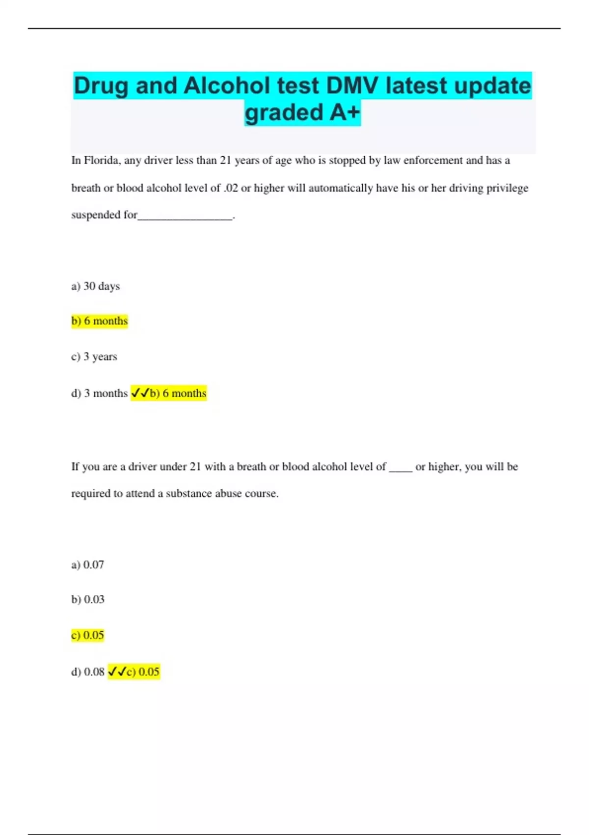 Drug and Alcohol test DMV latest update graded A+ In Florida, any driver less than 21 years of age who is stopped by law enforcement and has a breath or blood alcohol level of .02 or higher will automatically have his or her driving privilege suspended for________________. a) 30 days b) 6 months c) 3 years d) 3 months b) 6 months If you are a driver under 21 with a breath or blood alcohol level of ____ or higher, you will be required to attend a substance abuse course. a) 0.07 b) 0.03 c) 0.05 d) 0.08 c) 0.05 True or False: You may drive with parking lights only (in place of headlights). a) True b) False a) true It is safe to use your bright headlights if there is a car ahead of you within 300 feet. a) TRUE b) FALSE b) false If you fail to provide proof of insurance, your driver license and license plates will be suspended for up to________________. a) 3 years b) 30 days c) 1 year d) 6 months a) 3 years Your license can be suspended if you __________ a) fail to carry insurance on your vehicle. b) fail to stop for a school bus. c) commit retail theft. a) fail to carry insurance on your vehicle True or False: If you ride a bicycle in Florida, your bicycle is legally defined as a vehicle. a) True b) False b) False In Florida, if you have a learner's permit, you may only drive during ________________ for the first three months. a) School days b) Daylight hours c) The hours of 8 a.m. and 1 p.m.