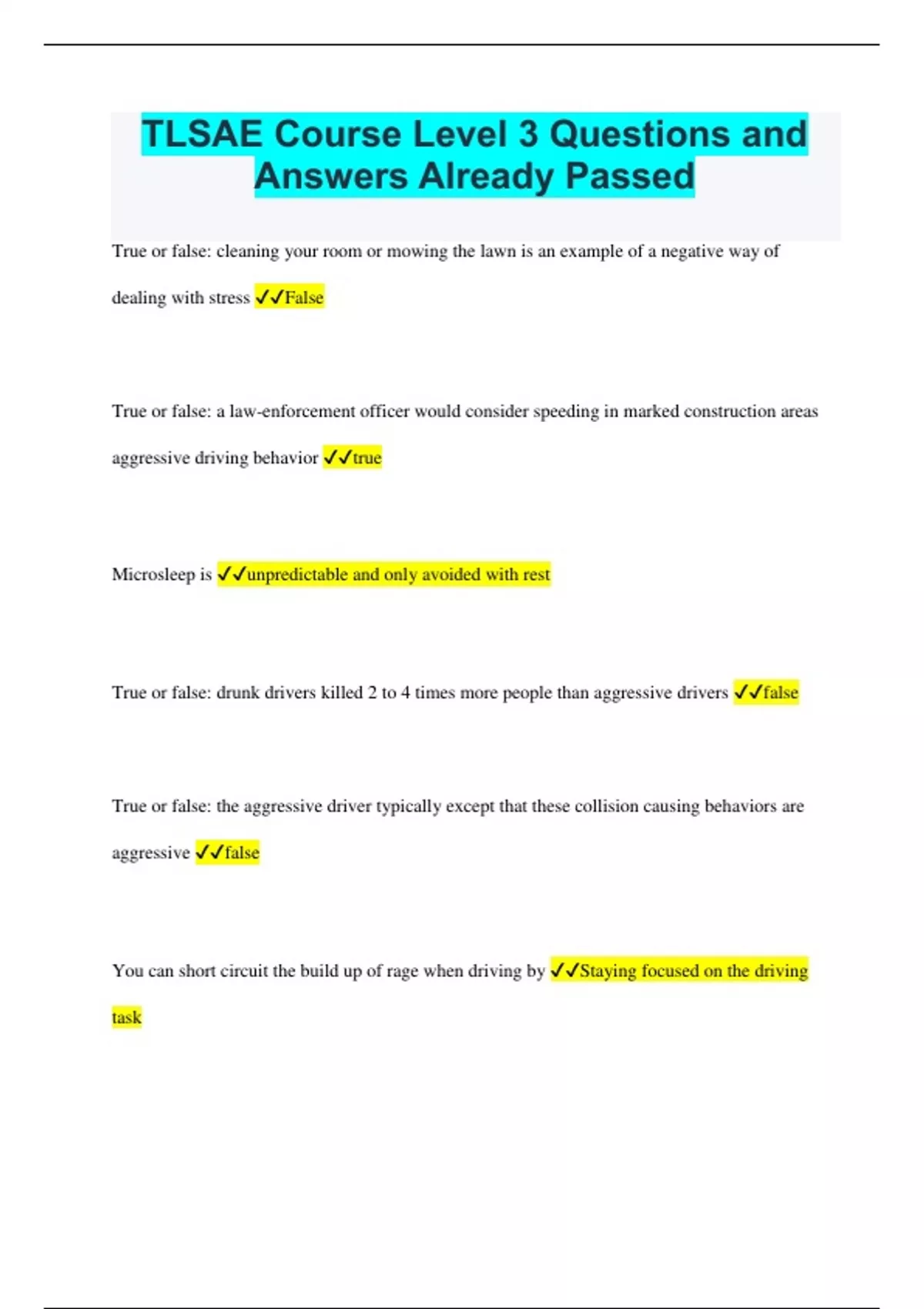 TLSAE Course Level 3 Questions and Answers Already Passed True or false: cleaning your room or mowing the lawn is an example of a negative way of dealing with stress False True or false: a law-enforcement officer would consider speeding in marked construction areas aggressive driving behavior true Microsleep is unpredictable and only avoided with rest True or false: drunk drivers killed 2 to 4 times more people than aggressive drivers false True or false: the aggressive driver typically except that these collision causing behaviors are aggressive false You can short circuit the build up of rage when driving by Staying focused on the driving task traffic jams, tailgaters, traffic restrictions, and slow-moving vehicles are examples of incidents and interactions that can cause ______ by drivers on the road way anger True or false: stress can effectively be relieved through physical activity, getting enough rest and sleep, and relaxation techniques true courteous behavior on the road will Benefit you and society in general True or false: lack of sleep is one of the leading causes of traffic fatalities True addictions may _______ friends and family alienate True or false: impaired individuals believe their judgment is fine, or perhaps better than normal true when addictions escalate and the individual loses his or her job or drops out of school, This is a sign of a serious problem _______ are more likely to use any illicit drug the non-drinkers Heavy use of alcohol For persons under the age 21 in Florida, drinking any alcohol is a piece of drinking because it is illegal The record of legal problems, including loss of license, jail, probation, and civil suits Can follow an individual throughout my lifetime