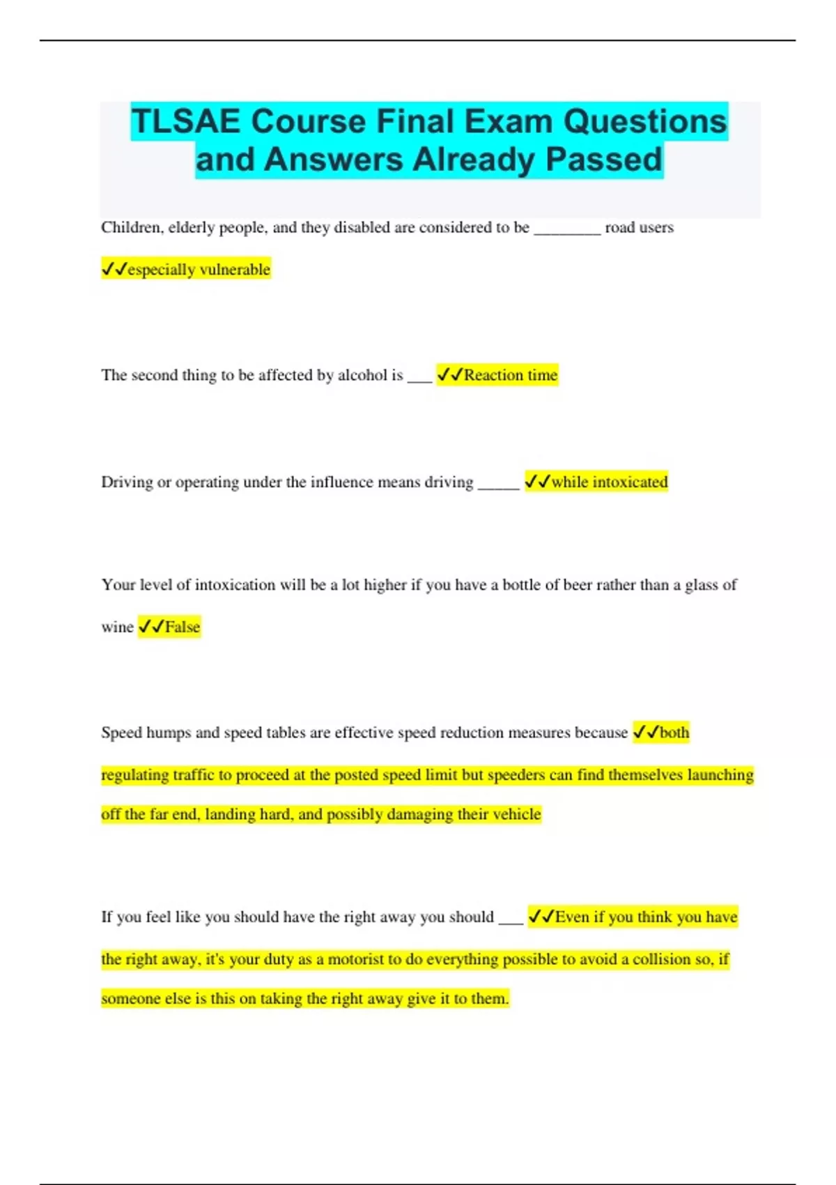 TLSAE Course Final Exam Questions and Answers Already Passed Children, elderly people, and they disabled are considered to be ________ road users especially vulnerable The second thing to be affected by alcohol is ___ Reaction time Driving or operating under the influence means driving _____ while intoxicated Your level of intoxication will be a lot higher if you have a bottle of beer rather than a glass of wine False Speed humps and speed tables are effective speed reduction measures because both regulating traffic to proceed at the posted speed limit but speeders can find themselves launching off the far end, landing hard, and possibly damaging their vehicle If you feel like you should have the right away you should ___ Even if you think you have the right away, it's your duty as a motorist to do everything possible to avoid a collision so, if someone else is this on taking the right away give it to them. Older drivers with a lot of driving experience are usually not at risk for a crash if they drink a small amount and drive False, they are still at risk Physical health problems, mental health/emotional problems, or family problems caused by a persons drug use is known as Abuse Alcohol can damage your liver, esophagus, stomach, pancreas, and heart True Over time, the body needs more more of a drug to get the high that once came easily True The no-fault law requires Owners of vehicle to purchase an insurance policy issued in the state of Florida A blue sign might designate a hospital On a city street you should be looking ahead as far as the car in front of you False, Aim high. Try to see at least 10 cars ahead of you Less than half of teens have tried marijuana in their lifetime True Taking sedating antidepressants even ______ hours before driving is equal to driving impaired 10 hours If your head falls up while you're driving, blocking your view of the road, you should Slow down and peer through the crack of the hood out the side window until you can pull off the road Each year over _____ people die in car crashes 33,000 More than 5 million collisions occur every Year Dependence is When a person stops using