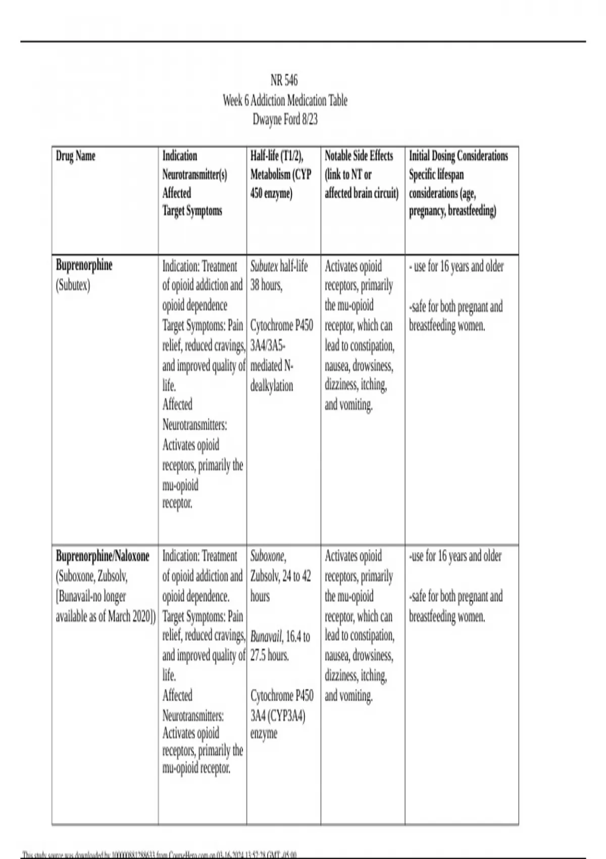 NR 546 Week 6 Addiction Medication Table Dwayne Ford 8/23