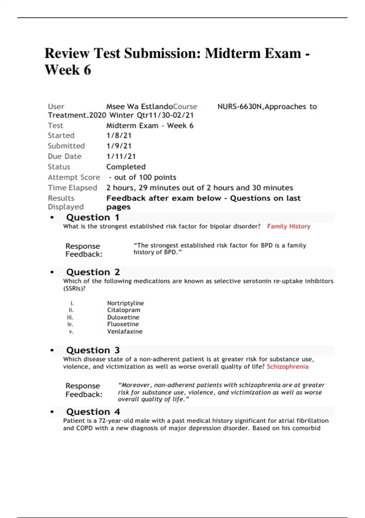 Review Test Submission: Midterm Exam - Week 6 User Msee Wa EstlandoCourse NURS-6630N,Approaches to Treatment.2020 Winter Qtr11/30-02/21 Test Midterm Exam - Week 6 Started 1/8/21 Submitted 1/9/21 Due Date 1/11/21 Status Completed Attempt Score - out of 100 points Time Elapsed 2 hours, 29 minutes out of 2 hours and 30 minutes Results Displayed Feedback after exam below – Questions on last pages What is the strongest established risk factor for bipolar disorder? Family History Response Feedback: “The strongest established risk factor for BPD is a family history of BPD.” Which of the following medications are known as selective serotonin re-uptake inhibitors (SSRIs)? i. Nortriptyline ii. Citalopram iii. Duloxetine iv. Fluoxetine v. Venlafaxine Which disease state of a non-adherent patient is at greater risk for substance use, violence, and vic