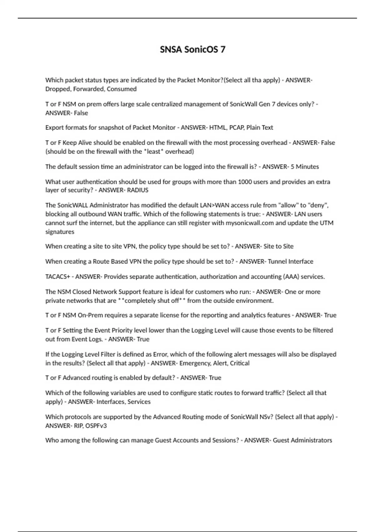 Which packet status types are indicated by the Packet Monitor?(Select all tha apply) - ANSWER- Dropped, Forwarded, Consumed T or F NSM on prem offers large scale centralized management of SonicWall Gen 7 devices only? - ANSWER- False Export formats for snapshot of Packet Monitor - ANSWER- HTML, PCAP, Plain Text T or F Keep Alive should be enabled on the firewall with the most processing overhead - ANSWER- False (should be on the firewall with the *least* overhead) The default session time an administrator can be logged into the firewall is? - ANSWER- 5 Minutes What user authentication should be used for groups with more than 1000 users and provides an extra layer of security? - ANSWER- RADIUS
