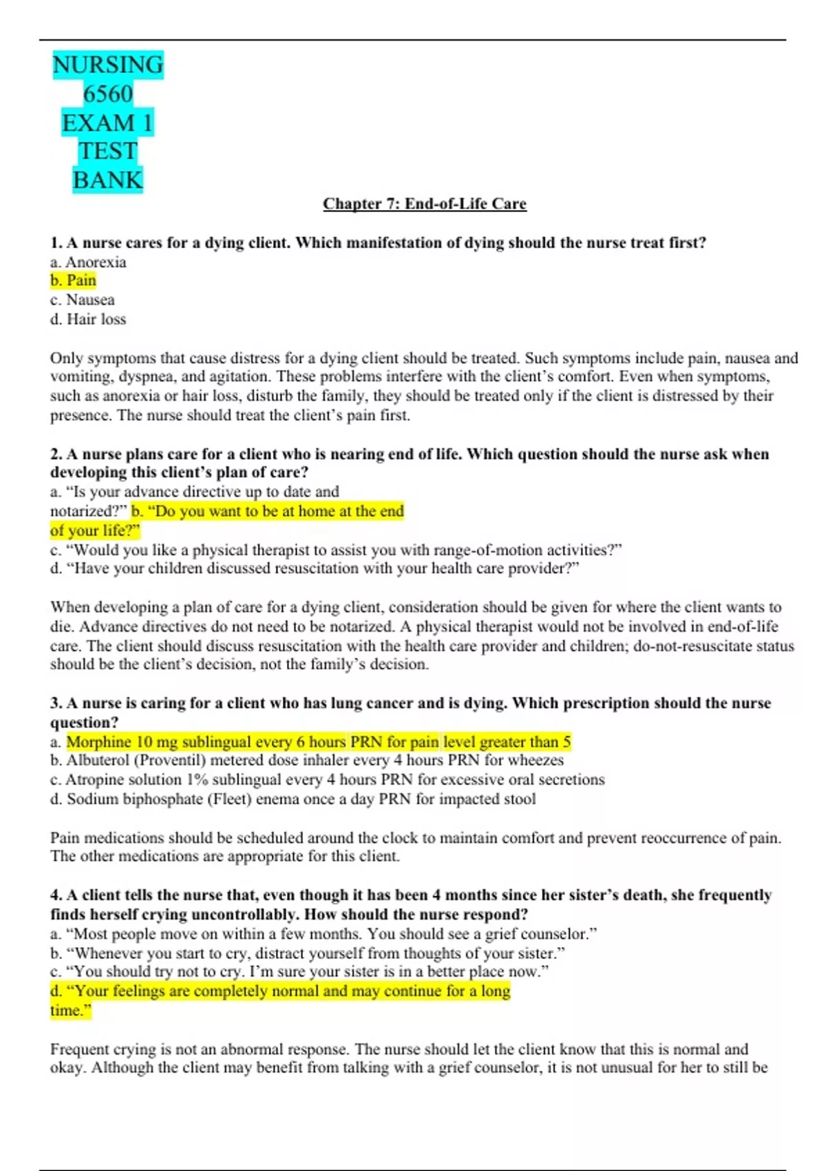 NURSING6560 EXAM 1 TEST BANK Chapter 7: End-of-Life Care 1. A nurse cares for a dying client. Which manifestation of dying should the nurse treat first? a. Anorexia b. Pain c. Nausea d. Hair loss Only symptoms that cause distress for a dying client should be treated. Such symptoms include pain, nausea and vomiting, dyspnea, and agitation. These problems interfere with the client’s comfort. Even when symptoms, such as anorexia or hair loss, disturb the family, they should be treated only if the client is distressed by their presence. The nurse should treat the client’s pain first. 2. A nurse plans care for a client who is nearing end of life. Which question should the nurse ask when developing this client’s plan of care? a. “Is your advance directive up to date and notarized?” b. “Do you want to be at home at the end of your life?” c. “Would you like a physical therapist to assist you with range-of-motion activities?” d. “Have your children discussed resuscitation with your health care provider?” When developing a plan of care for a dying client, consideration should be given for where the client wants to die. Advance directives do not need to be notarized. A physical therapist would not be involved in end-of-life care. The client should discuss resuscitation with the health care provider and children; do-not-resuscitate status should be the client’s decision, not the family’s decision. 3. A nurse is caring for a client who has lung cancer and is dying. Which prescription should the nurse question? a. Morphine 10 mg sublingual every 6 hours PRN for pain level greater than 5 b. Albuterol (Proventil) metered dose inhaler every 4 hours PRN for wheezes c. Atropine solution 1% sublingual every 4 hours PRN for excessive oral secretions d. Sodium biphosphate (Fleet) enema once a day PRN for impacted stool Pain medications should be scheduled around the clock to maintain comfort and prevent reoccurrence of pain. The other medications are appropriate for this client. 4. A client tells the nurse that, even though it has been 4 months since her sister’s death, she frequently finds herself crying uncontrollably. How should the nurse respond? a. “Most people move on within a few months. You should see a grief counselor.” b. “Whenever you start to cry, distract yourself from thoughts of your sister.” c. “You should try not to cry. I’m sure your sister is in a better place now.” d. “Your feelings are completely normal and may continue for a long time.” Frequent crying is not an abnormal response. The nurse should let the client know that this is normal and okay. Although the client may benefit from talking with a grief counselor, it is not unusual for her to still be grieving after a few months. The other responses are not as therapeutic because they justify or minimize the client’s response. 5. After teaching a client about advance directives, a nurse assesses the client’s understanding. Which statement indicates the client correctly understands the teaching? a. “An advance directive will keep my children from selling my home when I’m old.” b. “An advance directive will be completed as soon as I’m incapacitated and can’t think for myself.” c. “An advance directive will specify what I want done when I can no longer make decisions about health care.” d. “An advance directive will allow me to keep my money out of the reach of my family.” An advance directive is a written document prepared by a competent individual that specifies what, if any, extraordinary actions a person would want taken when he or she can no longer make decisions about personal health care. It does not address issues such as the client’s residence or financial matters. 6. A nurse teaches a client who is considering being admitted to hospice. Which statement should the nurse include in this client’s teaching? a. “Hospice admission has specific criteria. You may not be a viable candidate, so we will look at alternative plans for your discharge.” b. “Hospice care focuses on a holistic approach to health care. It is designed not to hasten death, but rather to relieve symptoms.” c. “Hospice care will not help with your symptoms of depression. I will refer you to the facility’s counseling services instead.” d. “You seem to be experiencing some difficulty with this stage of the grieving process. Let’s talk about your feelings.” As both a philosophy and a system of care, hospice care uses an interdisciplinary approach to assess and address the holistic needs of clients and families to facilitate quality of life and a peaceful death. This holistic approach neither hastens nor postpones death but provides relief of symptoms experienced by the dying client. 7. A nurse is caring for a dying client. The client’s spouse states, “I think he is choking to death.” How should the nurse respond? a. “Do not worry. The choking sound is normal during the dying process.” b. “I will administer more morphine to keep your husband comfortable.” c. “I can ask the respiratory therapist to suction secretions out through his nose.” d. “I will have another nurse assist me to turn your husband on his side.” The choking sound or “death rattle” is common in dying clients. The nurse should acknowledge the spouse’s concerns and provide interventions that will reduce the choking sounds. Repositioning the client onto one side with a towel under the mouth to collect secretions is the best intervention. The nurse should not minimize the spouse’s concerns. Morphine will assist with comfort but will not decrease the choking sounds. Nasotracheal suctioning is not appropriate in a dying client. 8. The nurse is teaching a family member about various types of complementary therapies that might be effective for relieving the dying client’s anxiety and restlessness. Which statement made by the family member indicates understanding of the nurse’s teaching? 