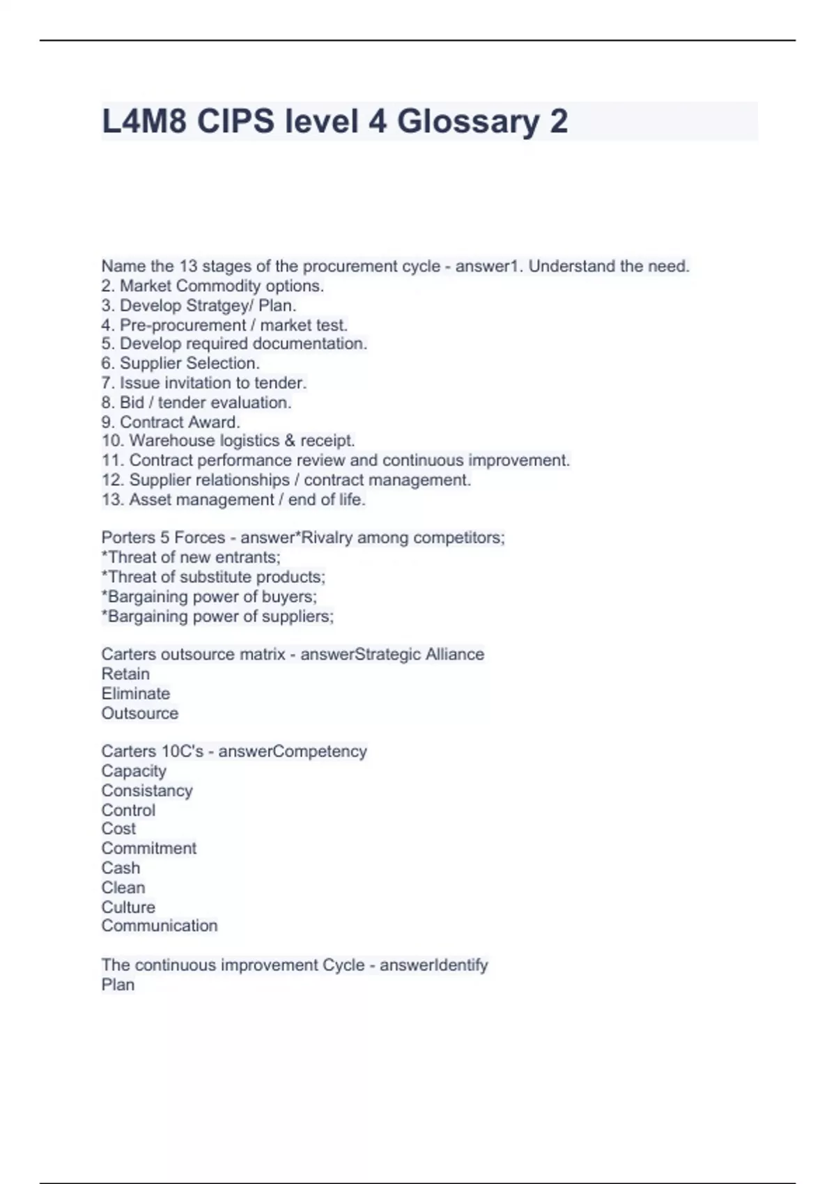 L4M8 CIPS level 4 Glossary 2 Questions and Answers 2024