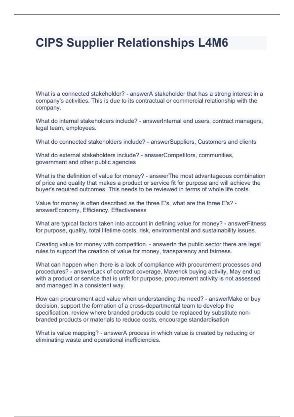 CIPS Supplier Relationships L4M6 Questions with Correct Answers