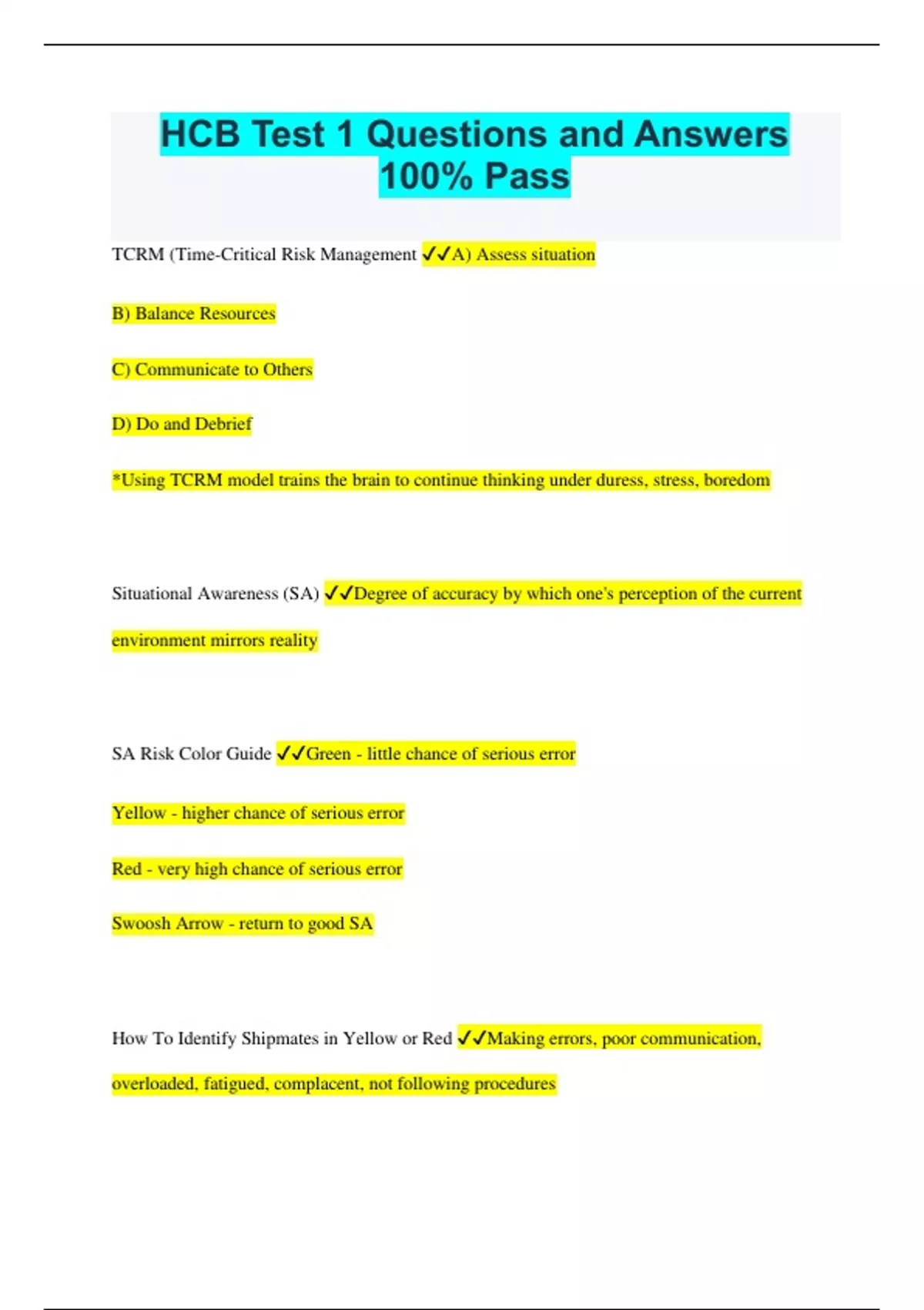 HCB Test 1 Questions and Answers 100% Pass TCRM (Time-Critical Risk Management A) Assess situation B) Balance Resources C) Communicate to Others D) Do and Debrief *Using TCRM model trains the brain to continue thinking under duress, stress, boredom Situational Awareness (SA) Degree of accuracy by which one's perception of the current environment mirrors reality SA Risk Color Guide Green - little chance of serious error Yellow - higher chance of serious error Red - very high chance of serious error Swoosh Arrow - return to good SA How To Identify Shipmates in Yellow or Red Making errors, poor communication, overloaded, fatigued, complacent, not following procedures Caduceus (kah-deuce) Rating insignia of Hospital Corps Sickbay/cockpit where sick and injured men were taken for care Surgeon Steward First enlisted rate requiring specific qualification Medal of Honor Highest military decoration (Armed forces) awarded for conspicuous gallantry and intrepidity at the risk of life above and beyond the call of duty. Distinguished Service Cross (DSC) Second highest military decoration (ARMY) awarded for extraordinary heroism Navy Cross Second highest military decoration (NAVY or MARINES) awarded for extraordinary heroism Silver Star Third highest military combat decoration (Armed Forces) awarded for gallantry in action Bronze Star Awarded to any person serving in the military after 6DEC1941 who distinguishes themselves by heroic or meritorious acheivement Purpose of Article 16 States that a convenient place shall be set apart for sick or hurt men.....and some of the crew shall be appointed to attend to and serve them and keep the place clean. Ship's Surgeon Trained physician Surgeon's mate Usually a physician but subordinate to surgeon (held warrant officer like status). Responsibilities more equivalent to modern senior HM Congress Mandate 2 March 1799 All newly commissioned sailing warships to contain a "cockpit" for treatment of sick and injured *unofficially re-established need for enlisted medical personnel Loblolly Boys -Served porridge (loblolly) to sick/injured -Classified as official rate in 1814 -Maintained cleanliness -provided water/containers to hold amputated limbs -heated tar for hemorrhage control -Filled buckets of sand to use for slip control with bloodstained decks Dates Loblolly Boys Served: (Quasi-War with France (first Barbary War) Loblolly Boys of Distinction John Wall (first one) John Domyn (first POW) Joseph Anderson (first African-American)