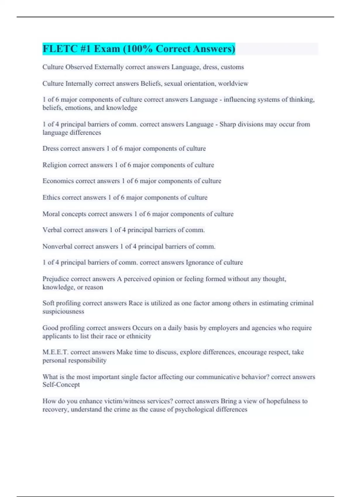Culture Observed Externally correct answers Language, dress, customs Culture Internally correct answers Beliefs, sexual orientation, worldview 1 of 6 major components of culture correct answers Language - influencing systems of thinking, beliefs, emotions, and knowledge 1 of 4 principal barriers of comm. correct answers Language - Sharp divisions may occur from language differences Dress correct answers 1 of 6 major components of culture Religion correct answers 1 of 6 major components of culture Economics correct answers 1 of 6 major components of culture Ethics correct answers 1 of 6 major components of culture Moral concepts correct answers 1 of 6 major components of culture Verbal correct answers 1 of 4 principal barriers of comm. Nonverbal correct answers 1 of 4 principal barriers of comm. 1 of 4 principal barriers of comm. correct answers Ignorance of culture Prejudice correct answers A perceived opinion or feeling formed without any thought, knowledge, or reason Soft profiling correct answers Race is utilized as one factor among others in estimating criminal suspiciousness Good profiling correct answers Occurs on a daily basis by employers and agencies who require applicants to list their race or ethnicity M.E.E.T. correct answers Make time to discuss, explore differences, encourage respect, take personal responsibility What is the most important single factor affecting our communicative behavior? correct answers Self-Concept How do you enhance victim/witness services? correct answers Bring a view of hopefulness to recovery, understand the crime as the cause of psychological differences