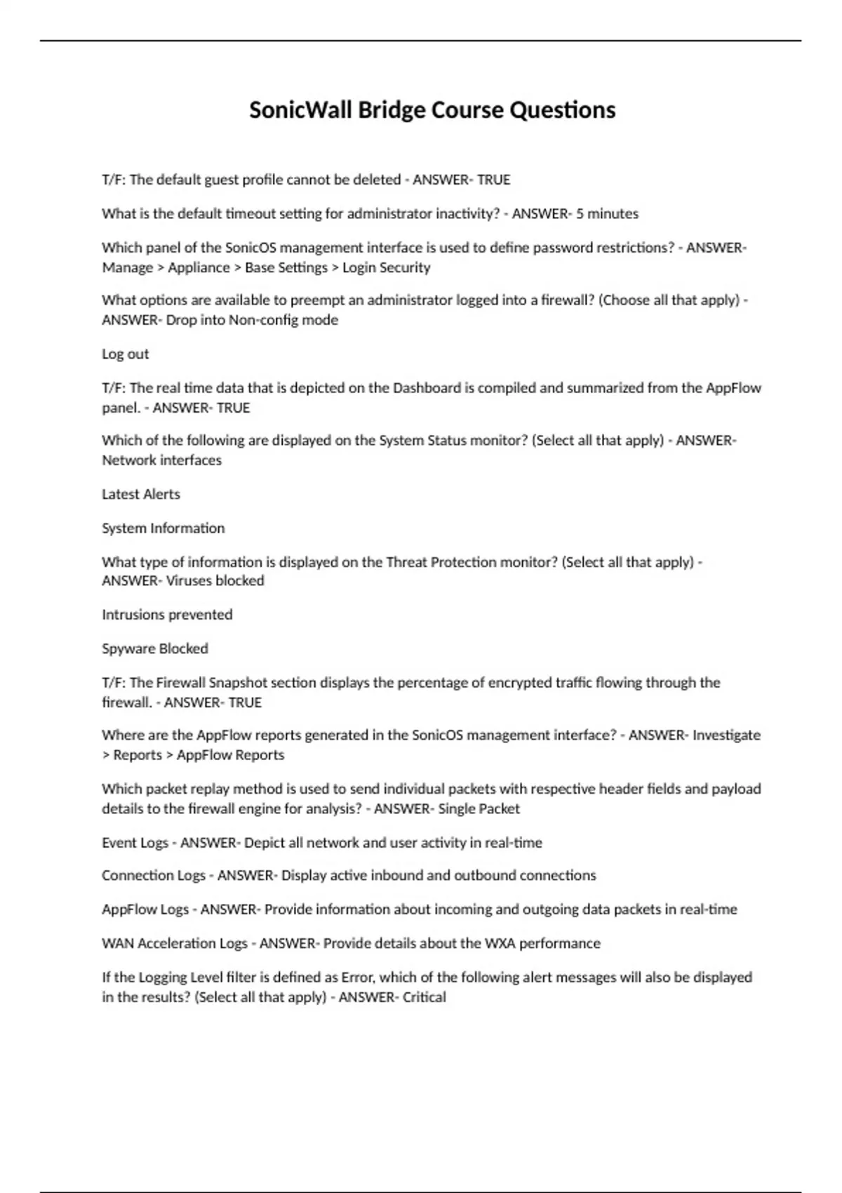 T/F: The default guest profile cannot be deleted - ANSWER- TRUE What is the default timeout setting for administrator inactivity? - ANSWER- 5 minutes Which panel of the SonicOS management interface is used to define password restrictions? - ANSWER- Manage > Appliance > Base Settings > Login Security What options are available to preempt an administrator logged into a firewall? (Choose all that apply) - ANSWER- Drop into Non-config mode Log out T/F: The real time data that is depicted on the Dashboard is compiled and summarized from the AppFlow panel. - ANSWER- TRUE Which of the following are displayed on the System Status monitor? (Select all that apply) - ANSWER- Network interfaces Latest Alerts System Information