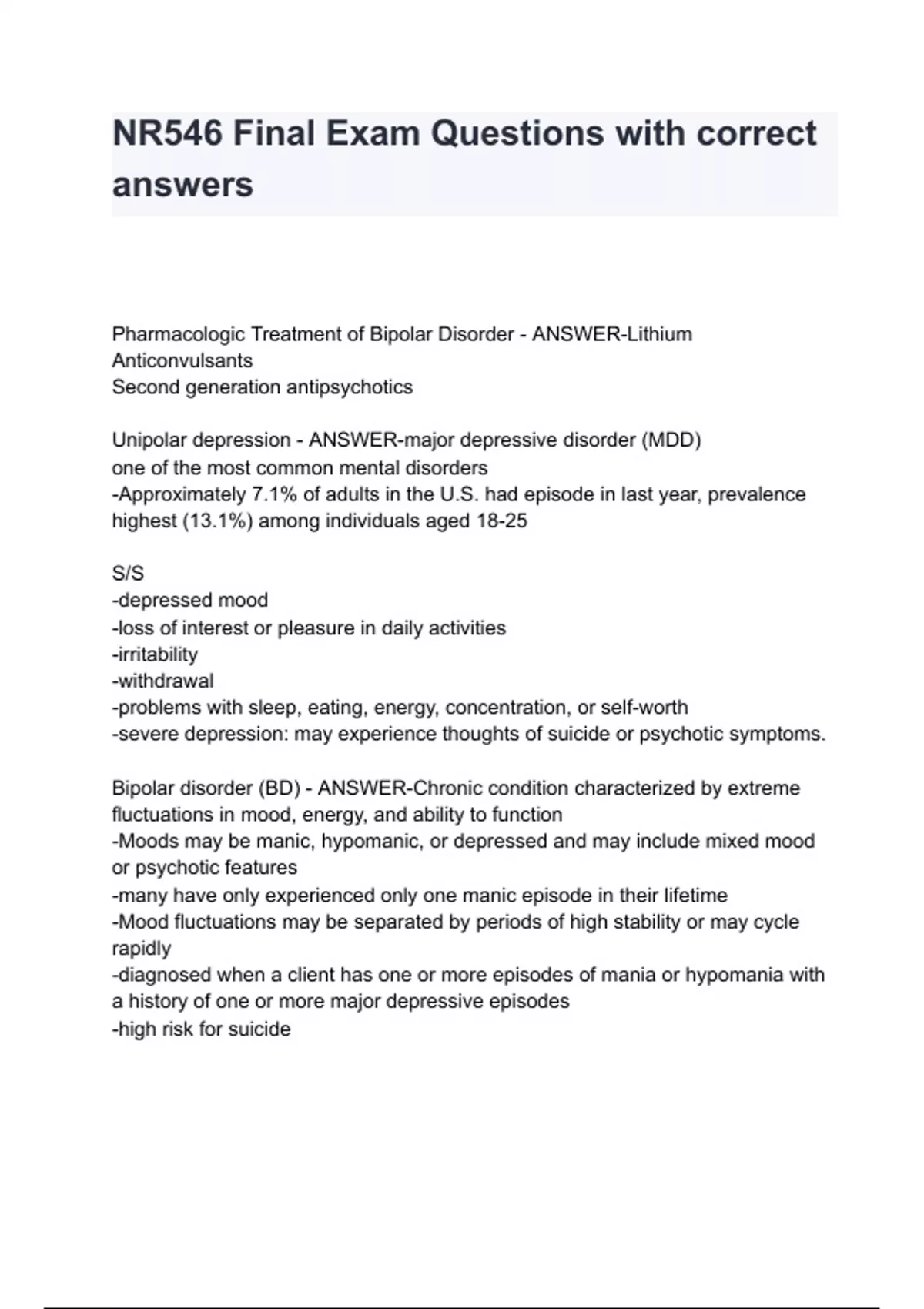 NR546 Final Exam Questions with correct answers Pharmacologic Treatment of Bipolar Disorder - ANSWER-Lithium Anticonvulsants Second generation antipsychotics Unipolar depression - ANSWER-major depressive disorder (MDD) one of the most common mental disorders -Approximately 7.1% of adults in the U.S. had episode in last year, prevalence highest (13.1%) among individuals aged 18-25 S/S -depressed mood -loss of interest or pleasure in daily activities -irritability -withdrawal -problems with sleep, eating, energy, concentration, or self-worth -severe depression: may experience thoughts of suicide or psychotic symptoms. Bipolar disorder (BD) - ANSWER-Chronic condition characterized by extreme fluctuations in mood, energy, and ability to function -Moods may be manic, hypomanic, or depressed and may include mixed mood or psychotic features -many have only experienced only one manic episode in their lifetime -Mood fluctuations may be separated by periods of high stability or may cycle rapidly -diagnosed when a client has one or more episodes of mania or hypomania with a history of one or more maj