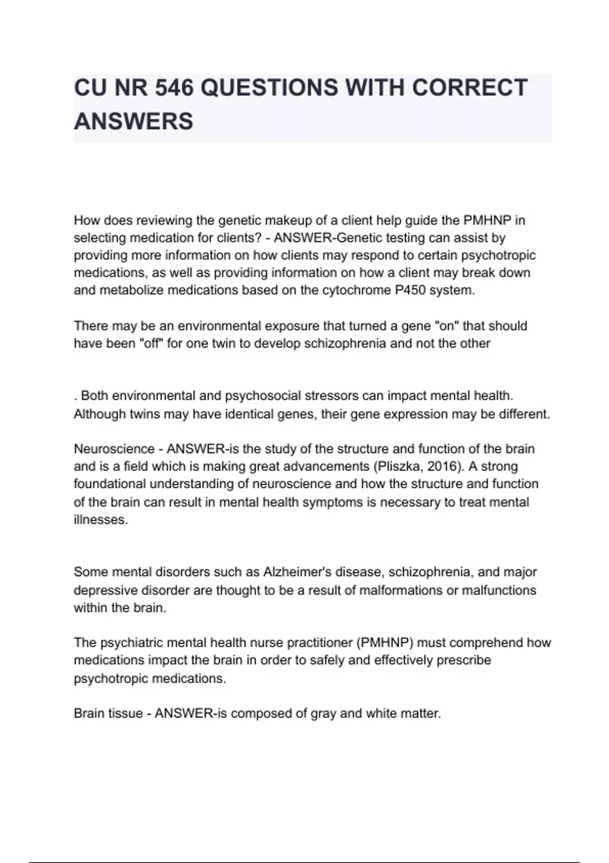 CU NR 546 QUESTIONS WITH CORRECT ANSWERS How does reviewing the genetic makeup of a client help guide the PMHNP in selecting medication for clients? - ANSWER-Genetic testing can assist by providing more information on how clients may respond to certain psychotropic medications, as well as providing information on how a client may break down and metabolize medications based on the cytochrome P450 system. There may be an environmental exposure that turned a gene "on" that should have been "off" for one twin to develop schizophrenia and not the other . Both environmental and psychosocial stressors can impact mental health. Although twins may have identical genes, their gene expression may be different. Neuroscience - ANSWER-is the study of the structure and function of the brain and is a field which is making great advancements (Pliszka, 2016). A strong foundational understanding of neuroscience and how the structure and function of the brain can result in mental h