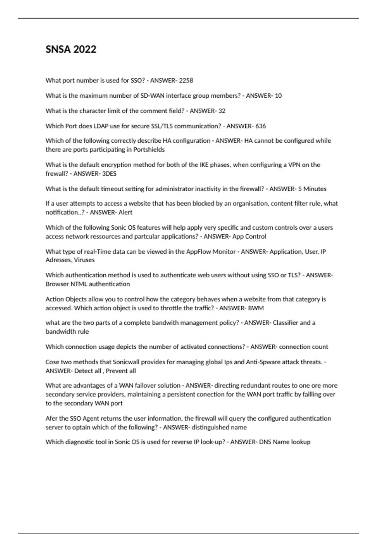 What port number is used for SSO? - ANSWER- 2258 What is the maximum number of SD-WAN interface group members? - ANSWER- 10 What is the character limit of the comment field? - ANSWER- 32 Which Port does LDAP use for secure SSL/TLS communication? - ANSWER- 636 Which of the following correctly describe HA configuration - ANSWER- HA cannot be configured while there are ports participating in Portshields What is the default encryption method for both of the IKE phases, when configuring a VPN on the frewall? - ANSWER- 3DES What is the default timeout setting for administrator inactivity in the firewall? - ANSWER- 5 Minutes If a user attempts to access a website that has been blocked by an organisation, content filter rule, what notification..? - ANSWER- Alert