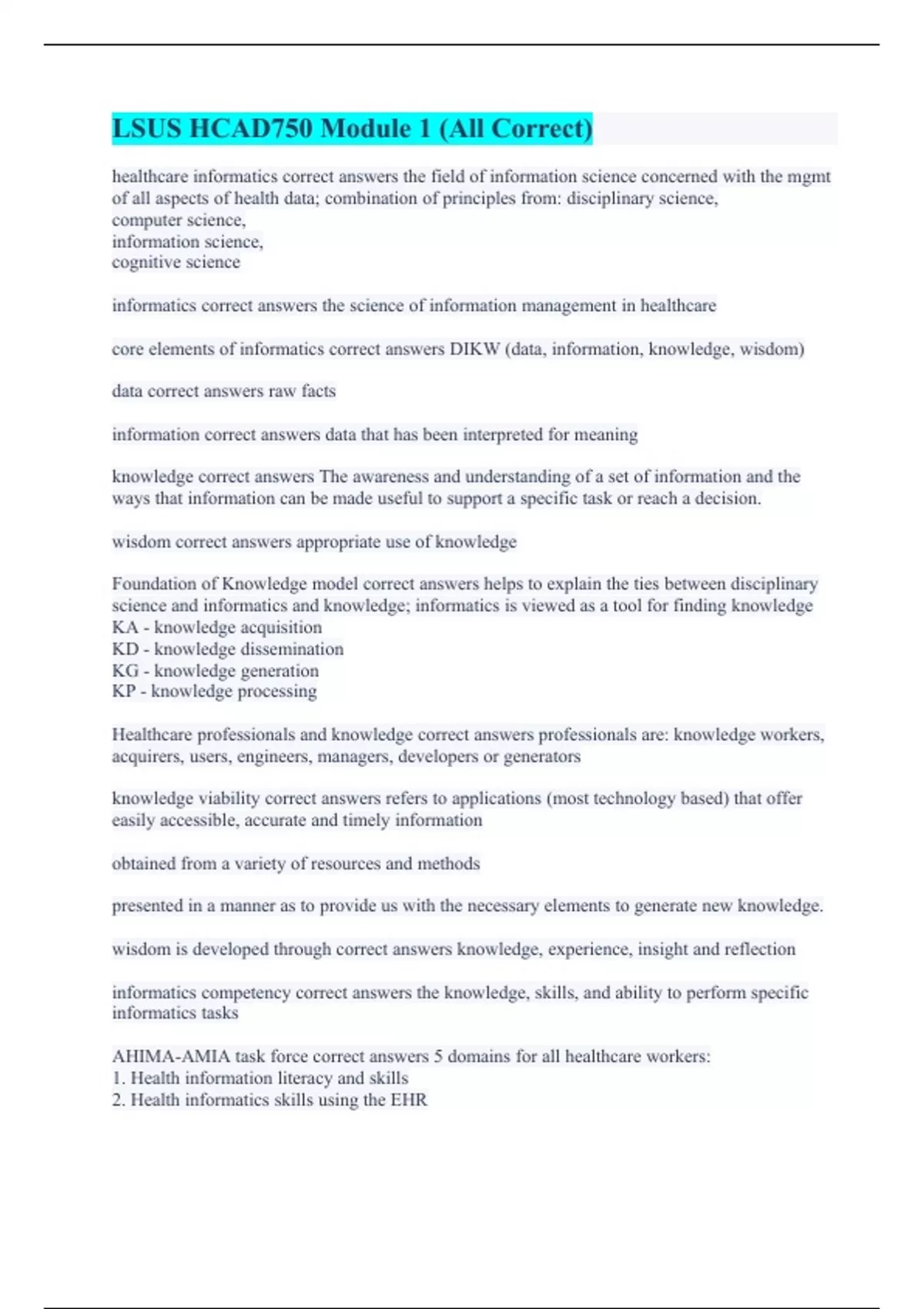 healthcare informatics correct answers the field of information science concerned with the mgmt of all aspects of health data; combination of principles from: disciplinary science, computer science, information science, cognitive science informatics correct answers the science of information management in healthcare core elements of informatics correct answers DIKW (data, information, knowledge, wisdom) data correct answers raw facts information correct answers data that has been interpreted for meaning knowledge correct answers The awareness and understanding of a set of information and the ways that information can be made useful to support a specific task or reach a decision. wisdom correct answers appropriate use of knowledge Foundation of Knowledge model correct answers helps to explain the ties between disciplinary science and informatics and knowledge; informatics is viewed as a tool for finding knowledge KA - knowledge acquisition KD - knowledge dissemination KG - knowledge generation KP - knowledge processing Healthcare professionals and knowledge correct answers professionals are: knowledge workers, acquirers, users, engineers, managers, developers or generators knowledge viability correct answers refers to applications (most technology based) that offer easily accessible, accurate and timely information obtained from a variety of resources and methods presented in a manner as to provide us with the necessary elements to generate new knowledge. wisdom is developed through correct answers knowledge, experience, insight and reflection informatics competency correct answers the knowledge, skills, and ability to perform specific informatics tasks AHIMA-AMIA task force correct answers 5 domains for all healthcare workers: 1. Health information literacy and skills 2. Health informatics skills using the EHR