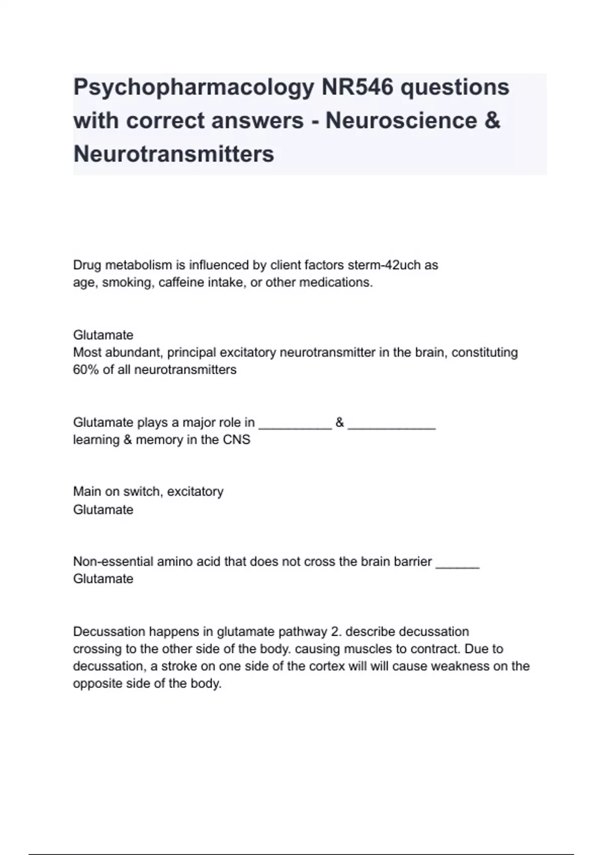 Drug metabolism is influenced by client factors sterm-42uch as age, smoking, caffeine intake, or other medications. Glutamate Most abundant, principal excitatory neurotransmitter in the brain, constituting 60% of all neurotransmitters Glutamate plays a major role in __________ & ____________ learning & memory in the CNS Main on switch, excitatory Glutamate Non-essential amino acid that does not cross the brain barrier ______ Glutamate Decussation happens in glutamate pathway 2. describe decussation crossing to the other side of the