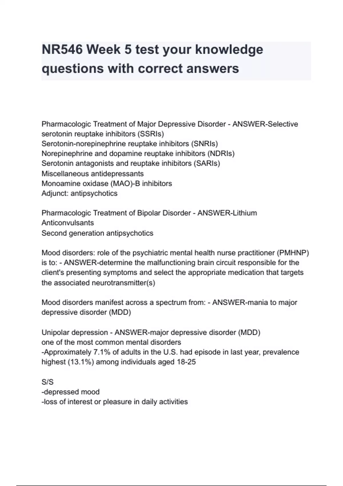 Pharmacologic Treatment of Major Depressive Disorder - ANSWER-Selective serotonin reuptake inhibitors (SSRIs) Serotonin-norepinephrine reuptake inhibitors (SNRIs) Norepinephrine and dopamine reuptake inhibitors (NDRIs) Serotonin antagonists and reuptake inhibitors (SARIs) Miscellaneous antidepressants Monoamine oxidase (MAO)-B inhibitors Adjunct: antipsychotics Pharmacologic Treatment of Bipolar Disorder - ANSWER-Lithium Anticonvulsants Second generation antipsychotics Mood disorders: role of the psychiatric mental health nurse practitioner (PMHNP) is to: - ANSWER-determine the malfunctioning brain circuit responsible for the client's presenting symptoms and select the appropriate medication that targets the associated neurotransmitter(s) Mood disorders manifest across a spectrum from: - ANSWER-mania to major depressive disorder (MDD) Unipolar depression - ANSWER-major depressive disorder (MDD) one of the most common mental disorders -Approximately 7.1% of adults in the U.S. had episode in last year, prevalence highest (13.1%) among